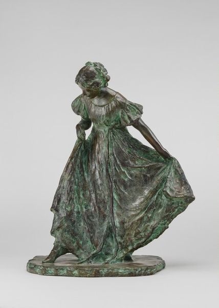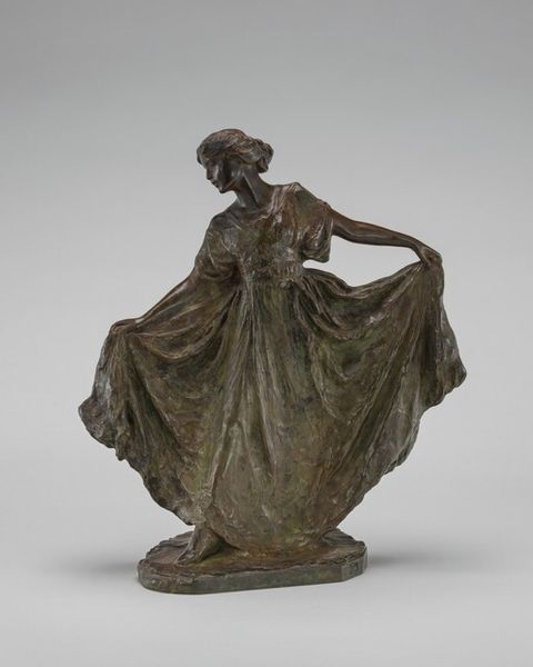 Curator: There's a certain melancholy to this piece. It's Vonnoh's "In Grecian Draperies," cast in bronze around 1913. She seems so lost in thought, doesn't she? Editor: Yes, that downwards gaze gives her a contemplative air, almost sorrowful. The draping fabric and the way she holds it seem significant too. Curator: The classical drapery is a powerful visual cue. It directly recalls the artistic vocabulary of ancient Greece, a period viewed, from the Renaissance onwards, as a golden age. Editor: So, the artist invokes cultural memory by associating her subject with this past ideal of beauty, balance and truth? The material feels alive, yet also conveys weight—literal and figurative. Curator: Precisely. Look closer; the drapery almost obscures her form, making her simultaneously present and elusive, physical yet spectral. Editor: I suppose this "in betweenness" also suggests a turn towards neoclassicism; you also see it with Canova and Thorvaldsen—though those pieces seem less sentimental and more celebratory. Curator: That's an astute point. Vonnoh, despite adopting a visual vocabulary which emphasizes idealism and serenity, introduces an emotional interiority not typically seen within neoclassical art. Editor: It’s such an interesting blend of idealized form and tangible emotion. Perhaps this explains her enduring appeal: beauty presented, yes, but filtered through experience. Curator: Ultimately, Vonnoh uses classicism to make the familiar monumental. She makes palpable the sense of introspection, bringing that which is immaterial into material being through powerful symbolic language. Editor: That emotionality elevates this sculpture. We get something much more complex than just an idealized portrait. Thank you for your reading! Curator: You are most welcome; I am glad to have had a chance to explore it with you today.