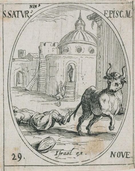 Curator: Jacques Callot's tiny etching, "Saint Marinus the Old," depicts a rather unsettling scene. It's part of a larger series on the lives of saints. Editor: My goodness, it's intensely dramatic! The cross-hatching amplifies the moment of sheer terror. Two bears mauling a man while onlookers casually observe…yikes! Curator: Right? The bears become symbolic agents of fate, or perhaps divine test. Note the contrast: the active violence below, and the passive observation above. Editor: The impassivity of those figures above is chilling. The bears might symbolize pagan forces, and Saint Marinus's ordeal signifies a spiritual trial by fire. Curator: Exactly. And the inscription "Israel ex." suggests the print was produced in France, adding another layer of historical context to its reading. Editor: Callot's ability to inject such emotion into such a small space is impressive. It makes you contemplate how suffering becomes sanctified, or even spectacle.