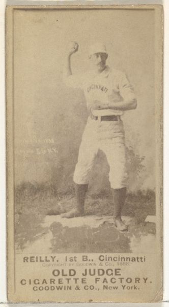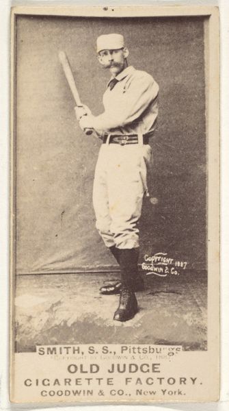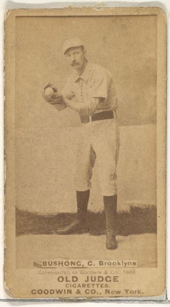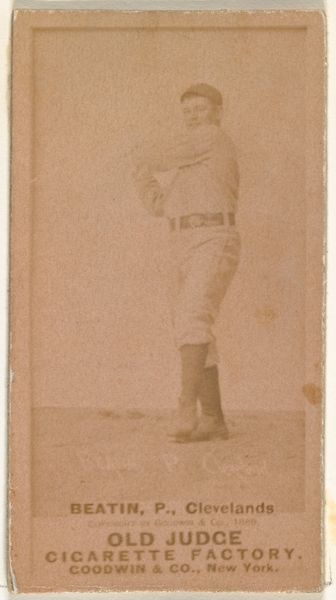 This albumen silver print, made by Goodwin & Company in the United States around 1888, was originally produced as a collectible card included in packs of Old Judge Cigarettes. The image presents Madden, a pitcher for Boston, in a posed studio shot rather than an action scene. Its meaning lies less in artistic innovation, and more in the burgeoning commercial culture of the late 19th century. Baseball was becoming America's pastime, and companies like Goodwin sought to capitalize on this popularity through promotional items. These cards reflect the era's advertising strategies and the increasing intermingling of sports, celebrity culture, and consumerism. Understanding this image requires diving into the business history of the time and examining the rise of mass media and its impact on leisure activities. By consulting archives, business records, and period publications, we can uncover the complex relationship between art, commerce, and the making of cultural icons. The meaning of this image is therefore contingent on its social and institutional context.
