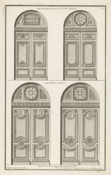 Curator: This is "Four Gates with Rosettes, Cornucopias, and Garlands" by Jean-François de Neufforge, dating from around 1760. It’s an engraving, part of a larger series of architectural designs. Editor: They certainly look…imposing. A little intimidating, even. So rigid and symmetrical. Is this about celebrating power, perhaps controlling who goes in and out? Curator: In many ways, yes. Neufforge was known for his architectural publications, which were essentially pattern books for builders and architects. This particular print highlights the material aspect of design, the specifics of doors meant for grand entrances, reflecting the opulence and the material resources available at the time. Editor: It strikes me how these designs emphasize exclusivity. We are talking about a society deeply structured by class; access was not a given. Each of these doorways makes a statement about social position, wouldn't you agree? Curator: Precisely. And it’s fascinating to consider the labor involved in producing both the designs themselves—the engraving process—and then the physical construction. The cost of materials alone would dictate a certain social standing. Consider the skilled labor that would go into each element – carving, joinery. These doors weren't mass-produced. Editor: The way these gates are ornamented, the rosettes and garlands...It evokes classical themes while making a powerful statement of the patron's wealth. These emblems certainly serve as a form of propaganda, almost as shields asserting privilege. Curator: Indeed. The architectural drawings weren't just functional diagrams, but potent indicators of economic capacity and status in 18th-century society. Neufforge captured an ideal. Editor: I am struck by the lasting power of these symbols. Examining historical works such as this gives insight to architectural choices and what they may truly reflect about cultural values. Curator: Reflecting on this image really gives us a tangible reminder that art extends far beyond simple aesthetics. Editor: I find these considerations offer insights into both how we value material display throughout history. It's not always what's within.