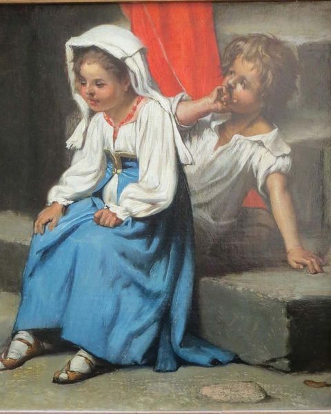 This painting, by Narcisse-Virgilio Diaz, shows us three young girls with puppies in what the artist imagines to be Turkey, and is rendered in oil on canvas. Diaz uses a painterly approach, with visible brushstrokes that allow us to appreciate the texture and viscosity of the paint itself. Look at the way the impasto creates depth in the fabrics, jewelry, and the puppies' fur. The layering of colors and blending of tones suggest the artist's interest in capturing the effects of light and atmosphere. The artist's skill is evident in his ability to depict the rich, decorative details of the girls' garments, drawing the eye into an orientalist fantasy. Diaz’s art reflects the aesthetics of his time, and the burgeoning taste for such images was fuelled by social factors like tourism and trade with the Middle East. This painting is not only an aesthetic experience, but also a signifier of its historical moment, shaped by colonial relationships and cultural exchange.