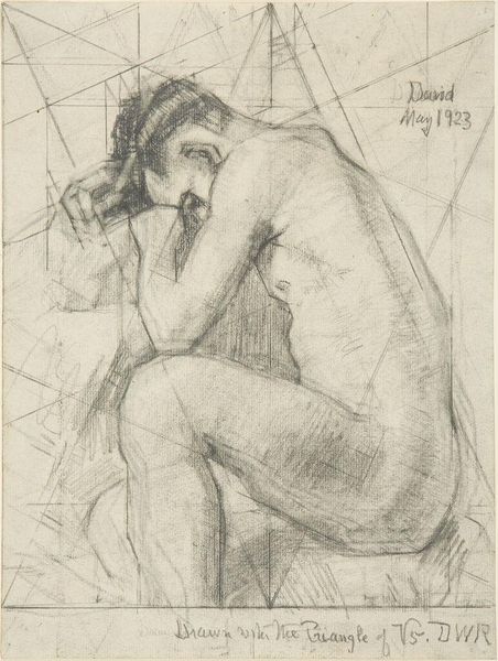 Curator: Here we have Denman Waldo Ross's "Seated Male Nude Resting his Head on his Hands," a sketch currently residing at the Harvard Art Museums. Editor: The figure seems burdened, almost collapsing inward. The visible grid and mathematical notations overlaid create a sense of being trapped by systems. Curator: Indeed. Ross was quite interested in systems of order; he sought to understand harmonies through mathematical and scientific principles. This drawing reveals the artist's underlying process. Editor: I can't help but wonder, though, about the sitter's state of mind. Is it exhaustion, existential questioning, or something else entirely suggested through that posture? Curator: That's precisely what makes this piece so compelling; it exists at the intersection of rigid structure and the vulnerability of the human form. Editor: It is as though the figure is weighed down by the very systems meant to bring order to the world. It is heavy. Curator: A fascinating collision of intention and interpretation.