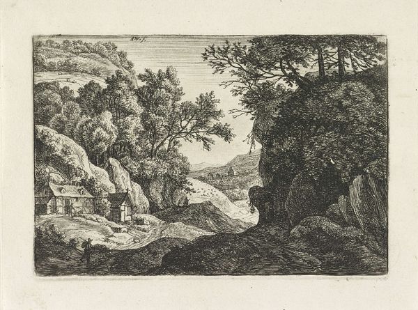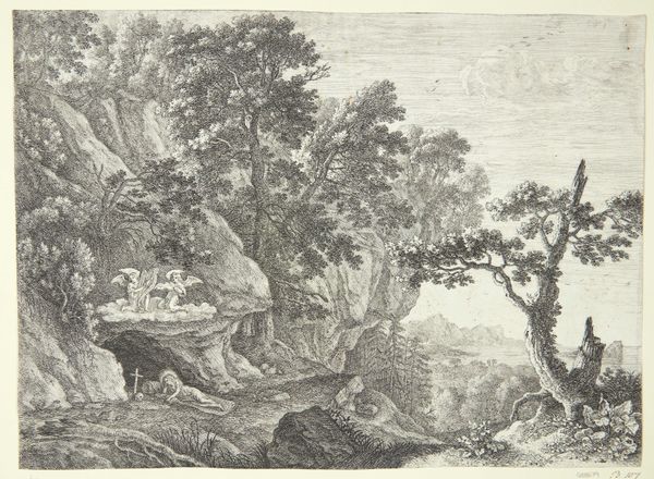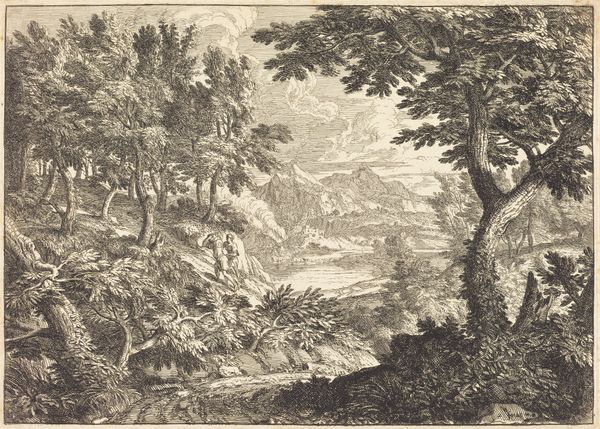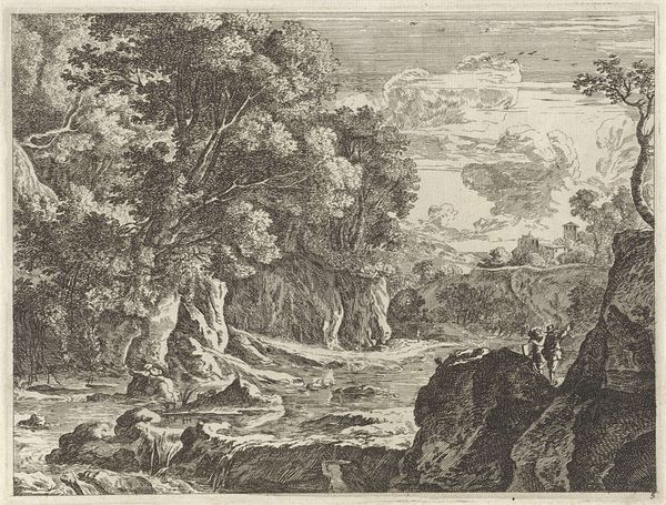 This landscape with two resting figures is an undated print by an anonymous artist, now held at the Rijksmuseum. The composition presents a serene vista, where nature's elements converge in tranquil harmony. The eye is drawn to the textured foliage, the jagged rocks, and the reflective water, all rendered with meticulous detail through etching. Linear precision and tonal gradations construct depth and form, inviting contemplation. The resting figures in the foreground serve as a focal point, grounding the viewer within the scene. Note how the artist employs a sophisticated system of signs, referencing pastoral traditions and idyllic landscapes. Yet, the piece is more than mere representation; the artist engages with ideas of space, perspective, and human interaction with nature. The print does not offer a singular meaning, but rather, multiple interpretations that continue to evolve. The work functions as part of a wider cultural dialogue about humanity’s relationship with the natural world.