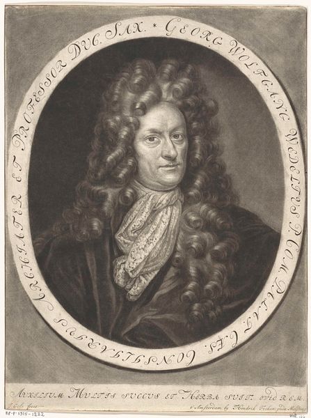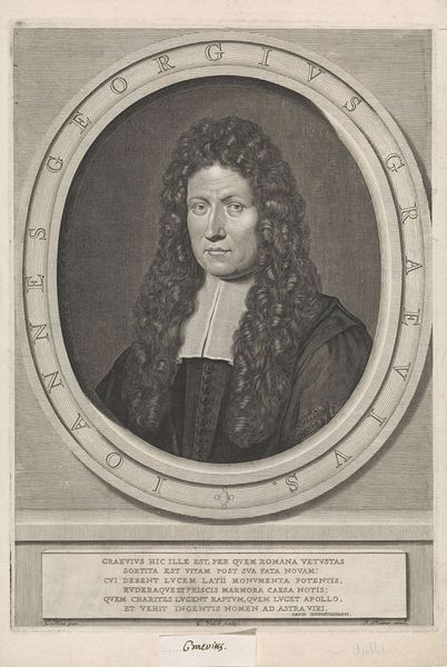 Editor: Here we have "Portret van de filoloog Johann Georg Graevius", a black and white engraving hanging here in the Rijksmuseum. It was made sometime between 1670 and 1713 by Pieter Schenk. That wig is something else! It definitely makes a statement. What jumps out at you when you look at this piece? Curator: Well, first, that wig *is* quite something, isn’t it? Think of it as visual shorthand. It practically screams 'Baroque scholar!' More seriously though, that elaborate hair is counterbalanced by the somber clothes, and how his eyes draw me in. His gaze is very direct and intellectual, wouldn’t you agree? It seems very characteristic of the Baroque interest in human drama, don't you think? Editor: Definitely, there's something powerful in the contrast, and it keeps the portrait from being too…frivolous, I guess? I didn't really think about what that hairstyle conveyed. The Latin inscription underneath; what’s its function here? Curator: Ah, yes! The inscription praises Graevius and connects him to both memory (Mnemosyne) and the arts (Apollo). Think of it as the 17th-century equivalent of a LinkedIn endorsement – highlighting his intellectual virtues. It tells us how Graevius wanted to be seen – not just as a man, but as a man of profound learning and creativity. Do you feel that comes across? Editor: I think I get it! It’s all about crafting an image, making a statement about status and intellect. This engraving feels much less static and stuffy now, actually, knowing about this purpose. Curator: Exactly! Sometimes, even the smallest details in a portrait – a wig, an inscription – can unlock a whole world of meaning. I’m glad it clicked for you. Editor: Me too. I never thought I’d get so intrigued by a Baroque wig, of all things! Thanks for that new perspective!