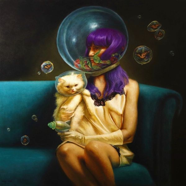 Rose Freymuth-Frazier’s painting presents a young woman holding two cats, adorned with flowers, butterflies, and aviator goggles. The oil paint, expertly applied, lends the piece a classical feeling. The smooth, almost polished surface allows light to subtly define the contours of her face and the soft fur of the animals, which speaks to the artist's technical skill and understanding of the medium’s potential. The attention to detail, especially in the rendering of textures, invites us to consider the labor involved in creating such a lifelike depiction. With its echoes of both Renaissance portraiture and surrealism, the image reminds us of the intertwined histories of creative practices, craft, and fine art. By embracing traditional techniques, the artist imbues the painting with a sense of timelessness. Ultimately, "Survivors" demonstrates the enduring power of materials and skilled making in conveying complex narratives and emotions.