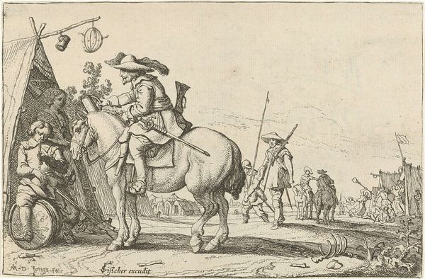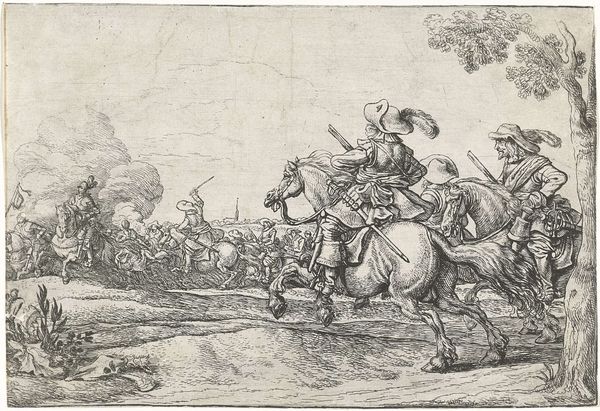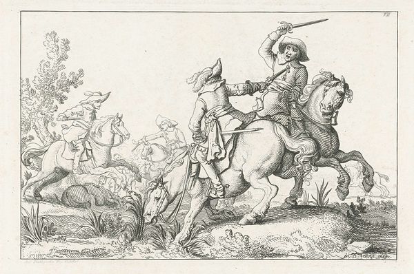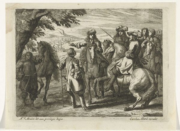 Jan van Huchtenburg created this artwork, "Commanders on Horseback," using etching. The composition captures a moment of military command, dominated by the figures of mounted leaders. The use of line and shading creates a textured surface across the landscape and figures, creating a dynamic interplay between light and shadow. The arrangement of the figures draws our eye towards the commander pointing into the distance, suggesting movement, direction, and purpose. The etching's structure is based on a semiotic system where horses symbolize power, and the commanders embody authority. These signs communicate a message of control and order. The use of space and perspective situates the leaders within a broader context, suggesting the scope and reach of their command. Notice how the formal qualities of the artwork, such as the direction of the lines and the arrangement of figures, function not just aesthetically but also as part of a larger discourse about power, leadership, and the representation of military might.