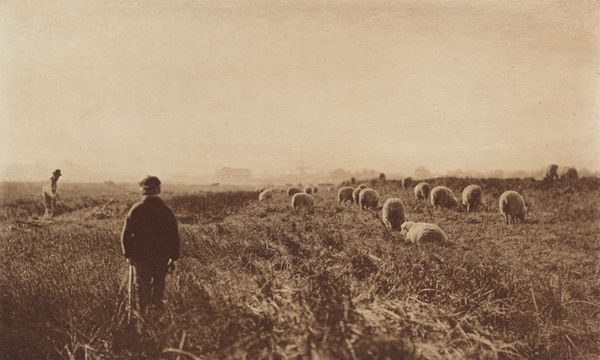 Nicola Perscheid made this photograph, Heimwärts, in Germany, likely in the early 20th century. Meaning "Homeward," the image depicts a shepherd and his flock, a seemingly simple scene that speaks to the socio-economic realities of its time. During this period, Germany was undergoing rapid industrialization, which led to significant social and economic changes. Rural communities faced challenges as people migrated to urban centers in search of work. This photograph, therefore, can be seen as a commentary on the changing landscape of Germany, perhaps romanticizing a disappearing way of life. The shepherd, a traditional figure, guides his flock, symbolizing a connection to the land and a slower pace of life. Photographs like this offer valuable insights into the social and cultural values of their time. We can consult historical records, economic data, and personal accounts to understand the context in which they were created and viewed.
