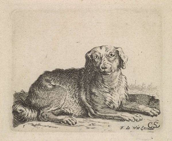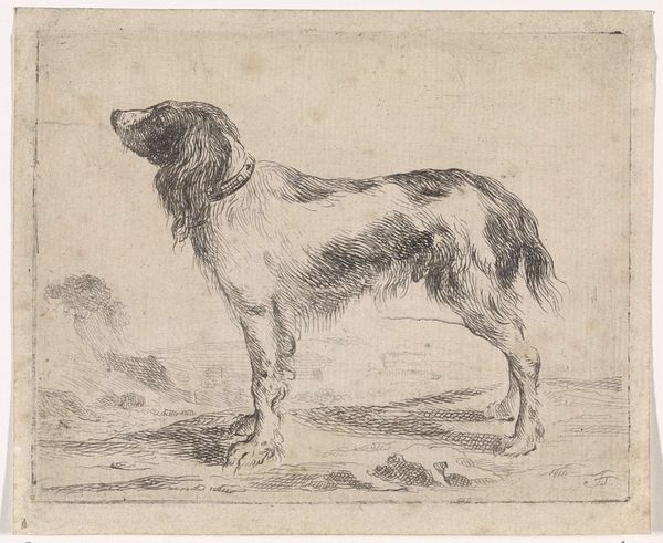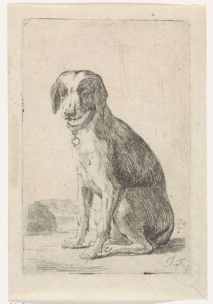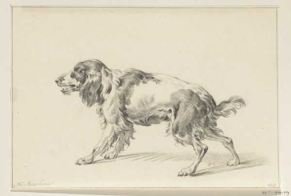 Jean Bernard created this drawing, Hond, with pen in gray on paper. Though undated, it reflects the 18th-century fascination with animals, particularly as companions. Dogs, like the one depicted, often symbolized loyalty and status within the domestic sphere. Consider how class is subtly referenced. The detailed rendering suggests a pampered pet, contrasting sharply with working animals, such as those used by women and the working class for hauling goods. The dog's gaze invites empathy, reflecting sentimental values that arose during this time. But the focus on domesticity also highlights the constraints placed upon women. The dog here offers a glimpse into the complexities of identity, history, and cultural values of Bernard’s era. It invites us to reflect on the human-animal bond and its cultural meanings.