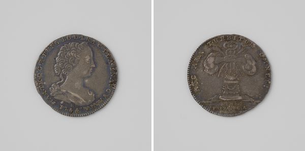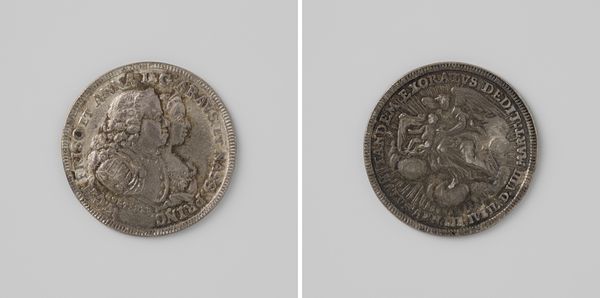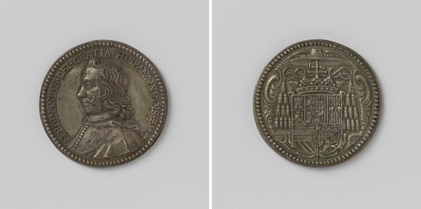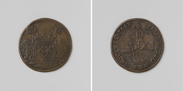Curator: This is a rekenpenning, a medal, commemorating Louis XIV’s swift conquest of Franche-Comté in 1668. It's part of the Rijksmuseum's collection. The Baroque style is evident even on this small scale. Editor: It’s surprisingly martial, even boastful. It is difficult to imagine that the intention of the work is simply financial. The low relief and dark metal contribute to a severe, perhaps even aggressive, aesthetic. Curator: Exactly! These weren't merely monetary objects; they functioned as propaganda tools, symbols of royal power circulated among elites. This one celebrates a very specific victory in a very particular way. The figure of the King with text is powerful in its reference and scale, and it is intentionally provocative given the historic power struggle. Editor: I'm struck by the contrast between the detailed portrait of Louis XIV on one side and the allegorical scene on the other. Note the figure of a lion cowering behind a barred gate – is it meant to symbolize the conquered region? The technical skill apparent in rendering these complex compositions in such a diminutive format is, itself, remarkable, if not even symbolic in that achievement. Curator: Indeed. The lion behind bars serves as a clear symbol of submission, reinforcing the narrative of French dominance and its historical impact. Consider its societal reception; these medals visually and tangibly cemented Louis XIV's image as an indomitable leader and French territorial ambitions in that particular time and place. It functioned as an early media blitz! Editor: Thinking about just the composition for a moment, that contrast between the proud figure and the allegorical figures on each side is fascinating. It creates a dynamic tension. This medal becomes more than just a commemorative object; it's a study in contrasts and visual storytelling that can't simply be dismissed given it's seemingly practical purpose. Curator: A perfect observation that illuminates how an object's functionality never fully accounts for the artistic message it conveys and it makes plain how such messaging impacts social understandings. Editor: So true. And focusing on this level of craftsmanship and deliberate contrasts brings us into new layers of insight about this potent small object.