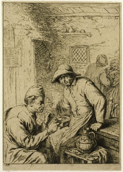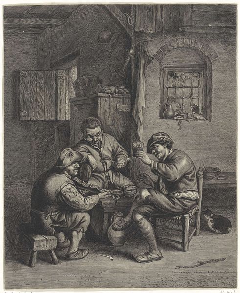 Jonas Suyderhoef created this print, "Three Peasants Sitting in an Interior," in the Dutch Republic, sometime in the 17th century. It presents a scene of everyday life: three men smoking and drinking, passing the time together, perhaps in a tavern. The Dutch Golden Age saw a flourishing of genre painting, which captured scenes of daily life for an expanding art market among the middle class. Prints like this one allowed for wider distribution of such imagery. The presence of tobacco, a relatively new commodity at the time, speaks to global trade networks and changing social habits. The tavern setting itself was a crucial social space, a place for the exchange of news and the formation of public opinion. Understanding this image fully requires delving into the economic and social history of the Dutch Republic, examining sources like period trade records and social commentary. By situating the image in its proper context, we can more fully grasp the historical meaning of what otherwise might seem a simple snapshot of 17th-century life.