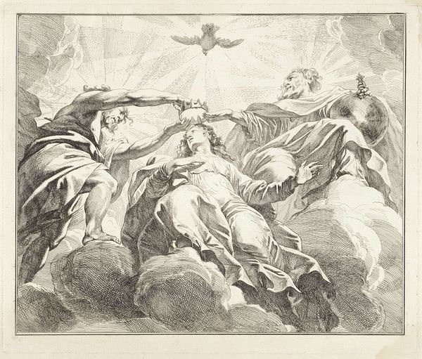 Editor: This is Pieter Tanjé's "Flora," currently residing in the Harvard Art Museums. It depicts the goddess Flora surrounded by cherubs. The cloud formations appear meticulously rendered. What compositional choices stand out to you? Curator: The strategic deployment of chiaroscuro immediately commands attention. Observe the stark contrast between the ethereal light illuminating Flora and the cherubs, and the denser shadows that define the cloudscape. How does this manipulation of light and dark influence your perception of depth and form? Editor: It gives the figures a sense of volume and separates them from the background. Curator: Precisely. Moreover, consider the use of line. Notice the delicate, almost fragile quality of the etched lines that define Flora's drapery, juxtaposed with the bolder, more assertive lines delineating the clouds. Editor: I see it now. The lines create such a soft, elegant mood. Curator: The composition clearly plays with the interplay of form and void, solid and ethereal. It encourages us to consider the underlying structure that supports this visually arresting image. Editor: I’ve certainly learned to appreciate the technical skill involved in creating such depth through contrasting light and line work.