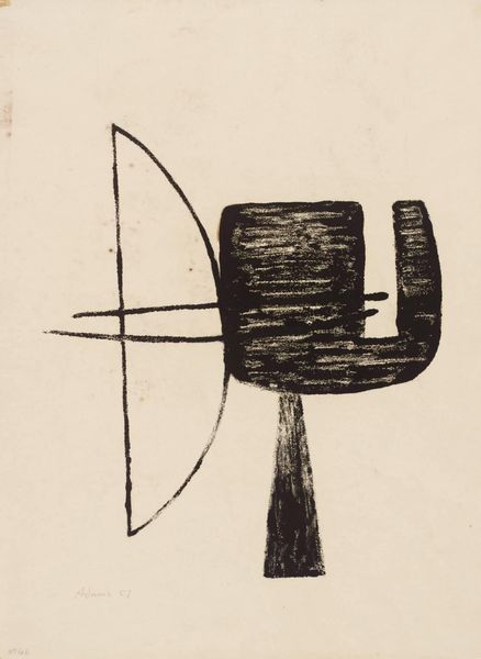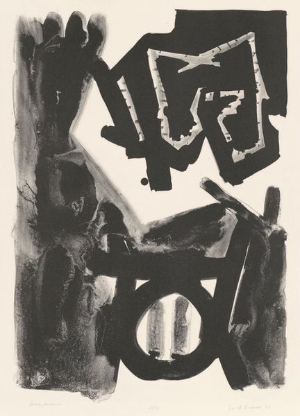 Adja Yunkers’ lithograph print, *Untitled (Large Abstraction)*, offers us a glimpse into the emotional landscape of mid-century abstraction. Yunkers, born in Latvia in 1900, navigated a world upended by war and political upheaval, experiences that profoundly shaped his artistic vision. The stark contrast between the bold, black shapes and the untouched white space speaks to Yunkers' exploration of form and feeling. As he once said, "I am concerned with the basic elements of art: space, form, color." This abstraction isn't just about aesthetics; it's an exploration of the self. We can consider the influence of his personal history and consider the experiences which might be imprinted onto the work. This work serves as a meditation on existence – a reminder that even in the most abstract forms, we find echoes of our shared human experience. It is a call to feel, reflect, and connect with the depths of our own understanding.