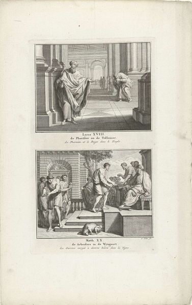 Editor: Here we have Jacob Folkema's 1791 engraving, "Koning Ahasveros woedend op Haman en Mórdéchai wordt beloond door koning Ahasveros," rendered with a beautiful old engraving style. The upper panel depicts anger and fear, while the lower scene is far more ordered. What historical dynamics do you see reflected in this work? Curator: This piece visually narrates power dynamics, focusing on the story of Esther. Think about it: a Jewish woman risks her life to subvert a genocidal plot against her people within the Persian Empire. Folkema’s engraving, produced in the late 18th century, begs the question: What parallels can we draw between Esther's time and Folkema's? How were issues of religious tolerance, gender roles, and resistance playing out in the late 1700s? Consider, too, how the "reward" scene still reinforces a patriarchal system despite Esther's bravery. What does it mean to be 'rewarded' within a system that inherently oppresses? Editor: That’s fascinating. I hadn’t considered how the act of being rewarded can still perpetuate systemic issues. The engraving makes you consider the nuance of such positions. Is Folkema subtly critiquing these power structures? Curator: It’s a valuable question to consider the artist's positionality. Understanding Folkema’s socio-political context—the rise of Enlightenment ideals alongside existing societal hierarchies—allows us to consider a possible commentary. Remember, the Bible has been and continues to be used to argue for the subjugation or emancipation of numerous peoples across gender, race, and ethnicity. Can Folkema be highlighting an inherent hypocrisy in the establishment? What is your perspective? Editor: Thinking about it through that lens definitely changes the impact of the artwork. Thanks for sharing your insight! Curator: It has been great to consider these vital angles alongside you!
