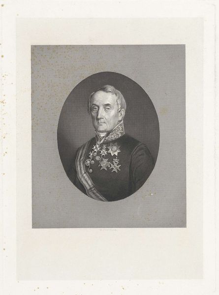 Curator: This is an engraving from 1858, titled "Portret van de predikant Wilhelm Broes," now held here at the Rijksmuseum. The artist is Dirk Jurriaan Sluyter. Editor: My immediate impression is of somber authority. The monochromatic palette emphasizes the sitter’s composed demeanor. It almost feels photographic, with the precision in the lines. Curator: Indeed, the print closely mimics the realism popularized by photography at the time. It depicts Broes in an oval frame, adorned with an order – likely a signifier of his social standing. But what interests me is the engraving itself. The precision suggests the skill involved and the engraver's access to materials; there must have been patronage. Editor: And the choice of print as the medium for portraying a religious figure also signifies how status was replicated and disseminated in mid-19th century Dutch society. Consider the rise of affordable prints, expanding the art market beyond wealthy elites. How does the accessibility influence the perception and impact of his religious message? Curator: That's fascinating. We can investigate further how images such as these supported the establishment. It points toward a democratization, but still controlled and measured through portraits of specific social and religious figureheads. The creation of such pieces was tightly controlled, from the lines employed, and even the type of paper utilized, every aspect adheres to social constructs and access. Editor: Precisely. It brings into the conversation notions about public persona, the social value attached to professions, and the institutional apparatus involved in representing, selling and circulating such prints in Dutch society. Curator: Looking closely, you can appreciate the artistry of engraving – the subtle variations in line thickness. Each element required painstaking work. We can examine and explore these skills. It begs the question of artistic value against the labor-intensive act of production, which must not be forgotten! Editor: Exactly! Viewing it this way helps reveal a bigger historical story, moving past pure aesthetic judgements, highlighting how material art embodies social, and political values of its period. Curator: It brings such a different dimension and expands the meaning beyond the surface impression. Editor: I agree. The portrait isn't only an image of a pastor, but also, the trace of economic structures that allowed it to exist.