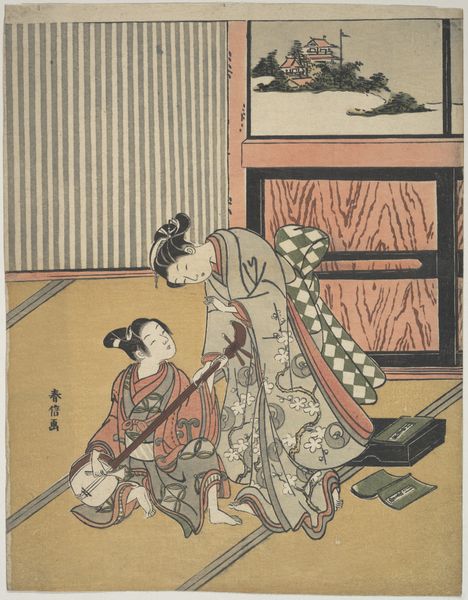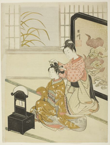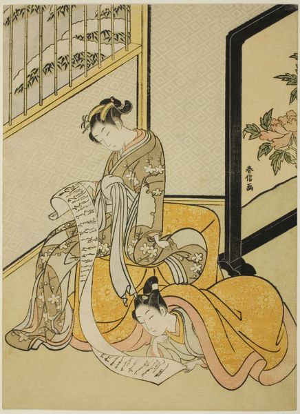 Editor: This print, "A Fan Peddler Showing his Wares to a Young Woman," by Suzuki Harunobu, made around 1765-1770, is incredibly delicate. I find it serene, capturing a quiet moment. How do you read the symbolism embedded within this scene? Curator: The imagery speaks volumes, doesn't it? The fans themselves are not just practical objects; they’re potent symbols. They evoke the ephemerality of beauty, the transience of fashion, and even social status. Do you see how the woman holds the fan, almost protectively? Editor: Yes, and the other woman is examining them closely, perhaps choosing one that speaks to her. It feels like more than a simple transaction. Curator: Exactly! This transaction hints at deeper meanings. What do fans represent in your own life? How are these delicate tools perceived and interpreted today compared to how they might have been perceived by its original audience? The arrangement of space, with the glimpse of the iris garden, suggests a world carefully curated for beauty and fleeting moments of connection. The iris also appears on fabrics, subtly reminding us of its symbolic power as a representation of springtime and vibrant life. Editor: It is amazing how much the simple objects contribute to a broader cultural understanding, I am finding this artwork incredibly intriguing. Curator: Indeed. It makes us think about how objects carry memory and communicate values across time, wouldn't you agree? Editor: Absolutely! Seeing this, I’ll definitely be paying closer attention to the visual language of everyday objects. Curator: Precisely, our daily surroundings, whether crafted by humans or rendered by nature, shape our feelings and thoughts.