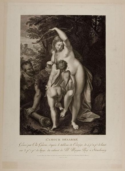Curator: There’s something so tender about this image. Mauro Gandolfi's "Education of Love" shows Venus guiding Cupid in the art of archery, or maybe simply aiming, hard to tell. The embrace feels so gentle. Editor: It does have a soft quality. The way the figures are nestled within that circular frame creates such an intimate viewing experience, almost like peering into a private world. But is it really about education? Curator: Well, perhaps ‘education’ is too literal. Maybe it’s more about the transmission of desire. Gandolfi's lifetime spanned a period of immense political and social change, and these classical themes served to highlight the unchanging nature of human emotion, don't you think? Editor: That's an interesting point, seeing the timelessness in it. I suppose, beyond the mythology, it is about that universal human experience—the delicate art of teaching and learning about love. Curator: Exactly! And it is a two-way street, like all good pedagogy. I walk away from this piece wondering if I've been paying close enough attention to how I am being taught to love, still, at my age. Editor: Hmm, food for thought. I, for one, now feel I understand a little bit better how art is shaped by the forces around it.