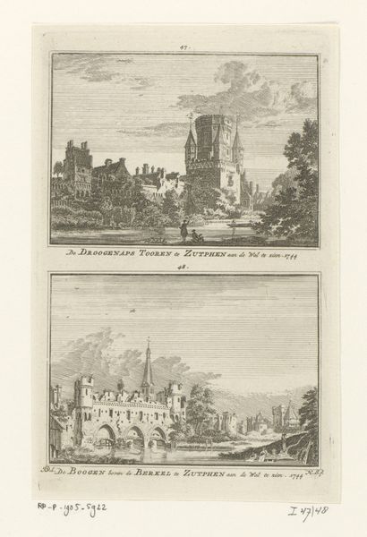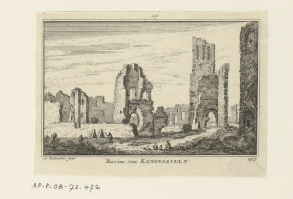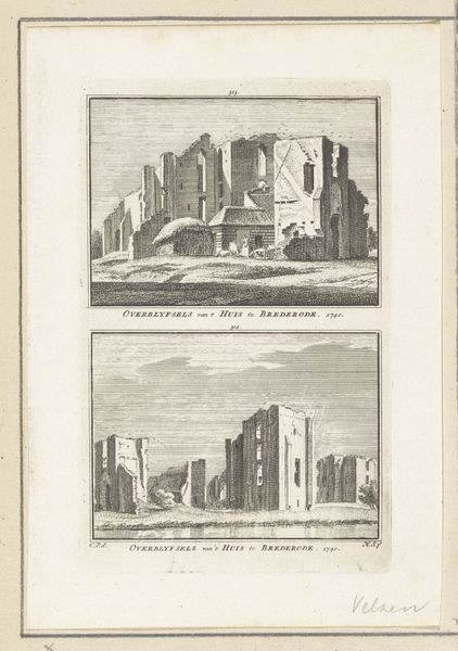 Hendrik Spilman created these two images of the Ruin of Huis ter Kleef in Haarlem in 1740, using etching and engraving. The fine lines, the textures of the stonework, and the atmospheric perspective are all achieved through meticulous work with a sharp burin. The image is a testament to the engraver's skill, capable of capturing the subtleties of light and shadow, and the details of the ruined architecture. This was not only an artistic exercise, but also a commercial one, as prints like these were often sold as souvenirs or historical records. Consider the labor involved in creating such a detailed image, the hours spent meticulously carving lines into a metal plate. This artisan skill highlights the convergence of craft and commerce in 18th-century printmaking. Spilman's work reminds us to value not only the aesthetic qualities of the image, but the labor, skill, and social context that brought it into being.