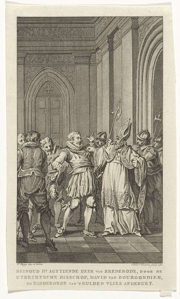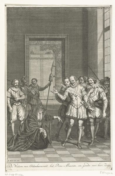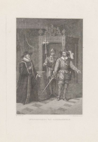 This engraving, created by Philippus Velijn, captures the moment 'The Lords of Schagen and Asperen Attempt to Free van Oldenbarnevelt' in 1618. The stark contrast between light and shadow immediately draws the eye to the figures positioned before a heavy doorway. Notice how Velijn uses line and form to create depth: the converging lines of the archway recede into the distance, framing the men who occupy the foreground. The texture of the stone walls, achieved through fine hatching, contrasts with the smoother surfaces of the noblemen's garments. The composition is structured to convey tension. The man on the right gesturing insistently, creates a dynamic diagonal that cuts through the static verticality of the doorway. The visual semiotics here are clear. The doorway might symbolize a boundary between confinement and freedom, while the pointing figure attempts to bridge this divide. Consider how Velijn's work destabilizes established power structures through its narrative and compositional elements. The act of attempting to free van Oldenbarnevelt can be seen as a challenge to the authority that imprisoned him.