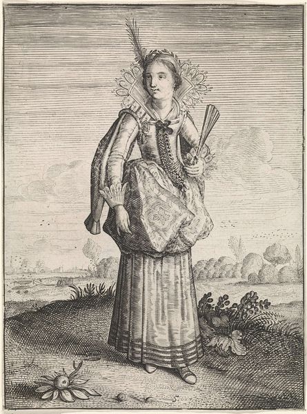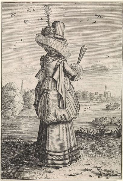 This is an undated engraving titled "Gezicht," made by an anonymous artist. The composition features a woman applying makeup before a mirror, set against an outdoor backdrop with an eagle perched nearby. The engraving's visual structure pivots on the contrast between the human and the natural, the refined and the wild. Note how the lines define the texture of fabrics and feathers differently. The woman's pose, combined with the mirror, creates a mise-en-abyme, a mirroring effect that complicates the viewer's perspective and understanding of reality versus representation. The woman's adornment is juxtaposed with the raw, untamed presence of the eagle. This challenges fixed categories, destabilizing traditional associations between beauty and nature. In closing, the engraving's detailed lines and composition highlight the complex interplay between surface and depth. It invites us to reflect on how we construct meaning through visual signs and cultural codes.