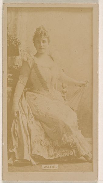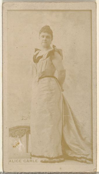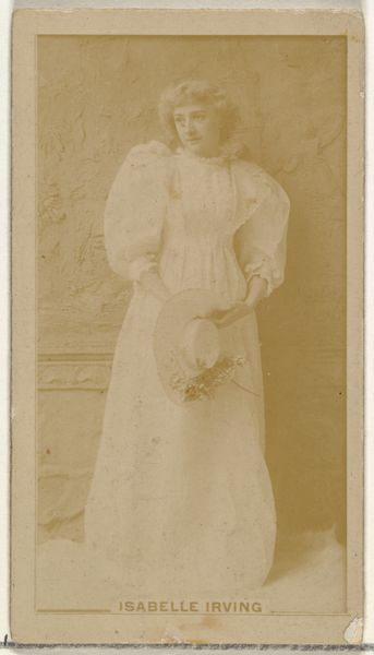 Curator: Welcome. We are standing before "Emily Bancker, from the Actors and Actresses series," dating circa 1890-1895. These portrait prints were produced by W. Duke, Sons & Co. as promotional items for Duke Cigarettes and became quite collectible at the time. Editor: It has such a melancholic quality. The sepia tone and the way her dress blends into the background, the fleur-de-lis wallpaper, it all creates this wonderfully faded atmosphere. Curator: Indeed, it's essential to consider these cards as part of the burgeoning consumer culture. The material object itself, this small print on paper, speaks to the intersection of entertainment, advertising, and the everyday lives of people acquiring and collecting them. Editor: What I find fascinating is the composition. Bancker’s averted gaze draws you in but then deflects any sense of genuine connection. Her stance feels rather formal, a common feature in portraiture of the period. It's all quite calculated, wouldn't you say? Curator: Calculated, certainly, within the means of production. These cards weren’t intended as high art. They were a low-cost, mass-produced commodity meant to drive sales of cigarettes. Her carefully chosen outfit and poised stance highlight her as a marketable commodity herself, playing into the idealized image of the actress. The choice of photography printed on paper shows this transitional state. Editor: I appreciate your emphasis on its cultural and economic purpose. Still, one cannot dismiss the purely visual effects. The soft gradations of tone and the interplay between the figure and the ground create a compelling image. There's also a deliberate flattening of space, almost echoing the conventions of theatrical set design. Curator: That "flattening" served to make reproduction cheaper. Every aspect, down to the paper quality, determined its value and availability in relation to cigarette purchases, shaping access and the audience. Editor: Well, viewing it now, the confluence of art, commerce, and performance that this little print embodies is what fascinates me the most. Curator: Exactly. By analyzing its context, materials, and means of distribution, we start to uncover deeper truths about labor, class, and consumer desire. Thank you for joining me today!