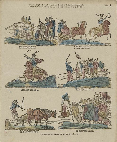 Curator: Editor: Right, so this is "Verschillende bezigheden" - or "Different Occupations" – a drawing made with pen and ink by Johan Noman sometime between 1806 and 1830. It looks like a page torn straight from a sketchbook. What jumps out to me is the variety of scenes and how playful it feels despite the rather serious military panels at the bottom. What do you see in this piece? Curator: Well, it *does* feel a bit like stumbling upon someone’s visual diary, doesn't it? Each little vignette offering a fleeting glimpse into 19th-century life, filtered through Noman's imagination. It’s like a sampler of daily pleasures and martial duties coexisting on the same page. Do you notice the short lines of Dutch below each scene? They seem to hint at moral lessons, perhaps? Editor: Yes! I can see the text below, and they do feel moralistic. It’s fascinating how he juxtaposes scenes of leisure with these military scenes. It almost feels a bit… sardonic? Curator: Sardonic, perhaps… or maybe just reflective of the times. After all, war was ever-present in that era, even amidst the burgeoning leisure activities of the middle classes. The way he renders each scene with such delicate lines, it lends a certain lightness to even the most bombastic displays of power. It all sort of hints at something fleeting, even futile, doesn't it? Editor: Absolutely! The lightness in his style really brings out the ephemerality. I think seeing the playful alongside scenes of war provides such interesting insight into life at this time! Curator: Exactly! And sometimes, isn't that what art is all about? Opening a small window into another world, a different time, a different way of seeing. It's quite amazing to think that all these scenes of normal life coexist. Thanks for sharing your observation! Editor: My pleasure, that was fascinating!