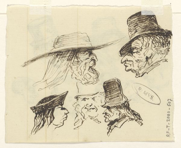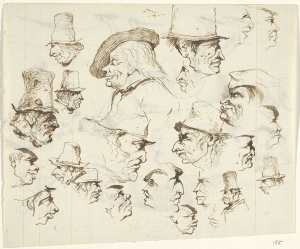 Editor: We are looking at "Koppen," an ink drawing from somewhere between 1840 and 1880, by Johannes Tavenraat, in the Rijksmuseum collection. It shows a series of quirky faces, almost like caricatures. The quick, almost frantic line work makes the images jump out at you! What can you tell me about what you see in this drawing? Curator: What strikes me first is the dynamism achieved through the economy of line. Tavenraat utilizes contour and hatching, predominantly, to suggest form, volume, and even personality. The density of the lines varies, creating areas of visual interest. Consider the hats, for example; they aren't mere coverings but structural elements that give a peculiar status to their wearers. Note the repetition of certain shapes--the noses, in particular--which gives the composition a strong sense of visual unity. Editor: I notice the exaggerated noses, too. Is that kind of exaggeration a typical characteristic of caricature? Curator: Indeed. But more than caricature, I see a study in physiognomy, the belief that facial features reveal inner character. The artist isn't merely copying appearance but attempting to extract a visual essence. Ask yourself, how do the precise lines used to construct the faces influence our reading of them? Editor: So it's not just about the subject of the drawing but also about the artist’s choice of lines and shapes that tells us something? It's more than just simple sketches? Curator: Precisely! The relationships between line weight, form, and composition invite us to explore the inherent language of art itself, beyond mere representation. What do you take away from this deeper observation? Editor: I'm beginning to see how every choice contributes to the overall effect, and that the beauty isn't just in the representation, but in the artistic construction of that representation. I see the relationship now. Thank you!