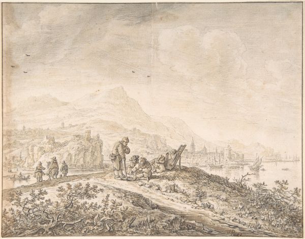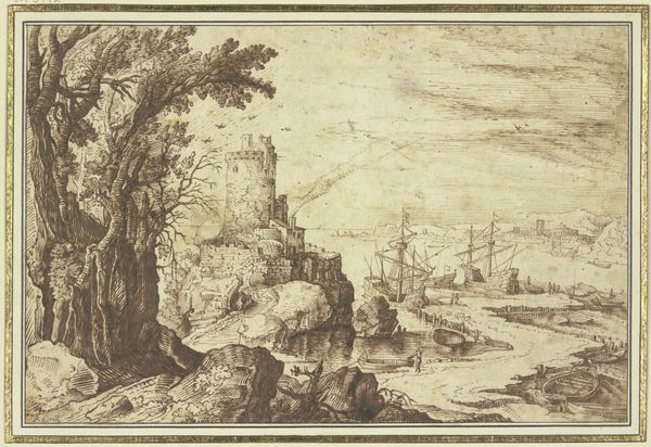 Curator: Domenico Campagnola’s "Imaginary Coastal Landscape with Ruins" – created sometime between 1500 and 1564, as the Renaissance was winding down – just pulls you into another world, doesn’t it? Editor: Absolutely, though "pulls" might be too gentle a word. It more like yanks you in! The stark, almost scratchy lines create a scene that feels both desolate and strangely vibrant. There's a sense of ruin, of course, but also of...energy, maybe from the materials and etching. Curator: Exactly! I think what gets me is that feeling of a dreamscape. Like, is this the future? The past? Campagnola is playing with these classical ruins, sure, but the very act of etching gives a sort of mass-producible feel – like he’s predicting our very modern obsession with reproducing imagery. Editor: Interesting! For me, it's all about the labour and material— the pen strokes, the bite of the etching acid on the plate. How long did it take him? What kind of acid was he using? Those lines suggest not just form but a repetitive, almost meditative process, very unlike some heroic Renaissance painting. I'm wondering, what would art for mass consumption even look like? Curator: Maybe this *is* it! Campagnola is pointing towards it with his attention to architectural precision amidst this crumbling scenery. He carefully lays out the bones of the buildings to then fill them with fantasy—what an alchemical mixture. He makes ink dance. Editor: I'm captivated by how this "Imaginary Landscape" sits between classical idealism and the brutal reality of material processes. Was it easy to access and get the needed material for etchings at that time? Where did this skill and raw materials originate and was distributed? Curator: So well said. In my mind, that tension is exactly what makes this landscape so lasting. Editor: Precisely! Each time I look at it, I feel an uncanny mixture of detachment from our traditional view and fascination to production’s accessibility back then. Thanks for shedding light on this amazing work.