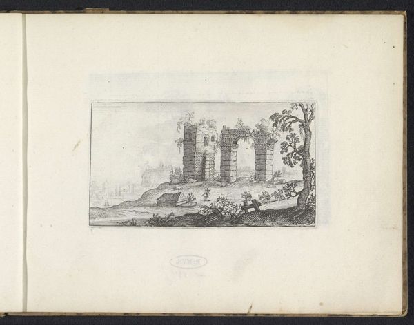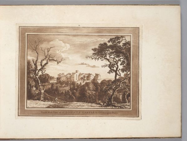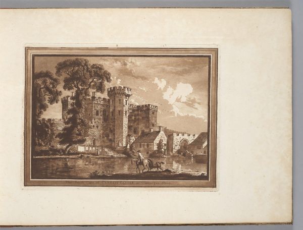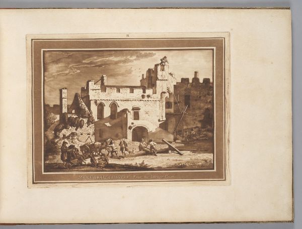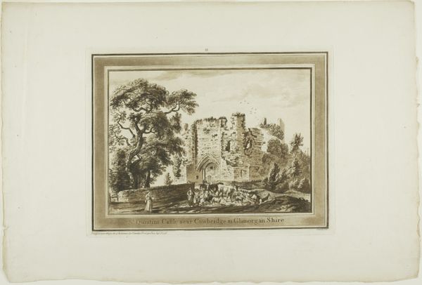 Curator: Paul Sandby's "St. Quintins Castle near Cowbridge in Glamorgan Shire" offers a glimpse into 18th-century Wales. The sepia tones lend a melancholic air to the scene. Editor: It is a rather quiet depiction, yes, almost like a memory fading into the past. The figures seem small and insignificant compared to the looming ruins. Curator: Indeed. Sandby was instrumental in popularizing aquatint, a printmaking technique that allowed for subtle tonal variations. It became a vital tool for representing the picturesque aesthetic then in vogue, celebrating ruins as emblems of past ages and power. Editor: I wonder about the socio-economic implications of such romanticized portrayals. Did they serve to obscure the realities of poverty and displacement during that period? What narratives were excluded? Curator: These are pertinent questions. Sandby, as an artist working within a specific historical context, inevitably reflected the biases and values of his time. Editor: Reflecting on it, this image becomes a mirror reflecting not just a castle, but the complex interplay of power, perception, and representation. Curator: Precisely. Art invites us to examine not just what is depicted, but why and for whom.
