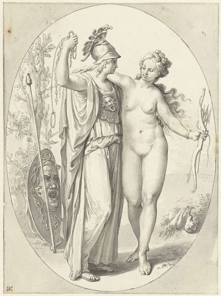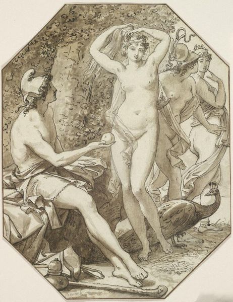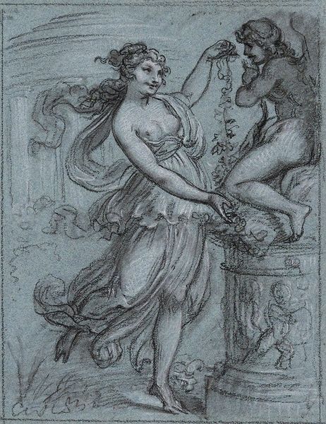 Curator: Anne-Louis Girodet's charcoal drawing, Pygmalion and Galatea, created around 1808, offers us a fascinating glimpse into Neoclassical interpretations of classical myth. What strikes you immediately about this piece? Editor: There's a striking stillness. Despite the dynamism of the subject – a sculpture coming to life – the overall impression is one of serene composure. The muted tones enhance that effect, contributing to the sense of restrained elegance, so typical of Neoclassicism. Curator: Indeed. And that stillness belies the quite revolutionary act taking place. Girodet’s approach, while formally quite academic, invites contemplation of societal constructs around creation and female agency. Pygmalion, a sculptor, creates a woman to his liking, embodying the male gaze's power over the female form. Editor: Absolutely. You can see Girodet meticulously employs line to define form and texture. Observe the contrasted textures: the smooth, idealized skin of Galatea against the drapery's flowing folds and Pygmalion's own rougher, almost frenzied rendering. It underscores that tension. Curator: Considering this piece was crafted during a time of upheaval with the rise and fall of Napoleon, one can interpret Pygmalion's act as a parallel to the creator imposing order, his own vision of beauty, onto a chaotic world, and perhaps controlling the destiny. Girodet seems to be interrogating who has the right to impose their ideal upon the other. Even little Cupid clinging to his leg, seemingly ready to encourage these actions. Editor: Yes, there’s a psychological charge beneath its surface, created using strictly formal choices of composition and contrasts, particularly in his unusual approach with shadow in a drawing—an innovation that marks Girodet's importance during this time. Curator: Seeing how the themes in this early 19th-century work about controlling image and creation of others is still very alive within art now, just goes to show you can look back and also consider the present day's narratives. Editor: Agreed; analyzing those choices, and considering its lines and tone help us appreciate it anew.