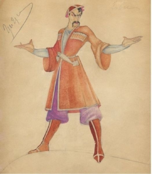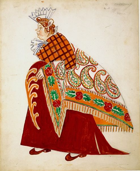 Editor: Here we have Ivan Bilibin's "Costume design for the Opera 'Prince Igor' by Alexander Borodin," created in 1930, using watercolor. The costume feels incredibly vibrant and stylized, yet it’s hard for me to put my finger on the cultural influences shaping the design. What strikes you about this work? Curator: Well, looking at it through the lens of cultural representation, especially from the Russian Avant-Garde period, we can ask some vital questions: Who does this costume design represent, and how accurately? Bilibin was engaging with orientalism, the West's fascination with and often misrepresentation of Eastern cultures. Note the "Polovtsian Dances" connection; consider how the opera itself may have exoticized the Polovtsians. How does the vibrant colour and ornate design play into preconceived notions of Central Asian cultures at that time? Editor: So you're suggesting it's less about a faithful portrayal and more about projecting a certain image? Curator: Exactly. We should explore the power dynamics at play. Russia had a complex relationship with its bordering Eastern cultures. The opera could be interpreted as either celebrating or appropriating non-Russian culture. Where do you see the tension arising in the design itself, where is it performative? Editor: I guess the emphasis on very ornate, almost stereotypical designs around the waist and headdress speak to a projection of power. The exaggerated tassles, jewels. And of course the bright red. It certainly does not read like functional clothing. Curator: Precisely! So by understanding its historical context, we see beyond the pretty colors and appreciate the artwork as a commentary on cultural exchange. Editor: I hadn’t considered those issues of representation, I now see there are a whole matrix of colonial ideas imbued in the art. Curator: Absolutely, this artwork is a window to understanding how power and culture intersect. Let's continue questioning who gets to tell which story.