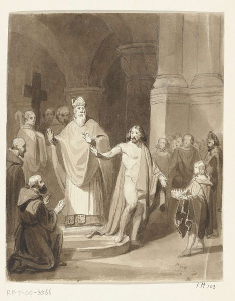 Editor: We're looking at "An Ancient Sacrifice," a pen and ink drawing from around 1800 by Clément Pierre Marillier. The scene is grand, set in a classical temple, but the grayscale tones lend it a sort of solemn, muted feel. What strikes you about this piece? Curator: It hums with a quiet drama, doesn’t it? Marillier masterfully uses line work here—so crisp—to evoke a sense of historical weight, of ritual. Notice how the light seems to emanate not just from the torch, but from the figures themselves. Almost as though their devotion is its own source of illumination. What does the staging tell us, do you think? Editor: Well, everyone is arranged around the central figure, the one holding the bowl… almost like he's presenting something sacred. But to whom or what? The mood is serious, as if what he is doing carries significant importance. Curator: Precisely! And think about what "sacrifice" really means here. It’s not just about loss; it's about offering something of value, making a transaction with the divine. The composition reflects that perfectly. And isn’t it intriguing that it doesn't depict a battle or a coronation? Editor: It makes you wonder what specific story Marillier is referencing. Maybe something less monumental, but deeply personal? Curator: Possibly, the artist certainly left the interpretation fairly open. Though I find myself pulled toward imagining this not as a reenactment of some singular event but perhaps as a romantic, if nostalgic, vision of civic virtue. Something of value, indeed. Editor: That is certainly insightful! Thank you! I will be taking away new insights regarding narrative and staging today. Curator: The pleasure was mine, thank you! It has certainly changed the way I shall perceive "An Ancient Sacrifice" moving forward.