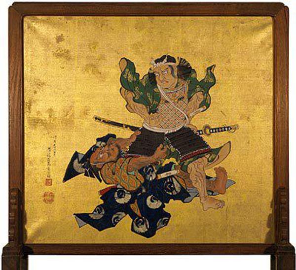 Editor: Nandalal Bose’s “Annapurna,” a watercolor from 1943, is incredibly striking. The colour palette and use of line are evocative and dynamic. What jumps out to me immediately is the contrast between the two central figures. How do you interpret this work, seeing it through a formalist lens? Curator: Initially, the work strikes me as operating along two axes. Note how Bose employs contrasting chromatic arrangements. A vivid gradient of oranges establishes the plane, while a cerulean disc encircles the Goddess. Consider, too, how the figures differ in line. The Goddess' figure flows elegantly with a more classically proportioned structure while the other form, more skeletal, occupies stilted space. What effect is created? Editor: It makes it feel like two distinct planes, with separate but connected modes of being. The use of color, line, and overall construction give these figures different characteristics, and separates them formally. The male deity is bony, seemingly flayed. Do you believe this work attempts to communicate cultural information? Curator: Precisely. We see, formally, a deconstruction, an application of abstraction. Note the colour choices: orange for base earthly elements and a spectral cerulean above for enlightenment, which serve to further isolate these forms as planes of being within the structure of the image itself. The cultural narrative is being advanced in terms of formal play of chromatic presentation, form, and material application. What of that application interests you most? Editor: It would have to be the use of line to communicate figural divergence! I really had not understood the degree to which visual composition is meaning. Thanks for the new insights! Curator: Indeed! These compositional methods, as employed by Bose, invite the viewer to engage deeply with how the very structure of a piece builds meaning. It is in this relationship that art finds itself.