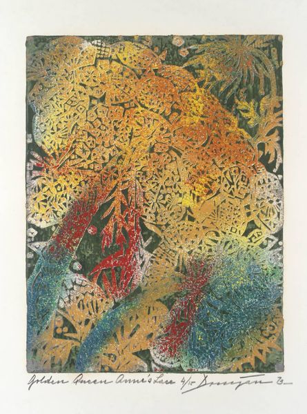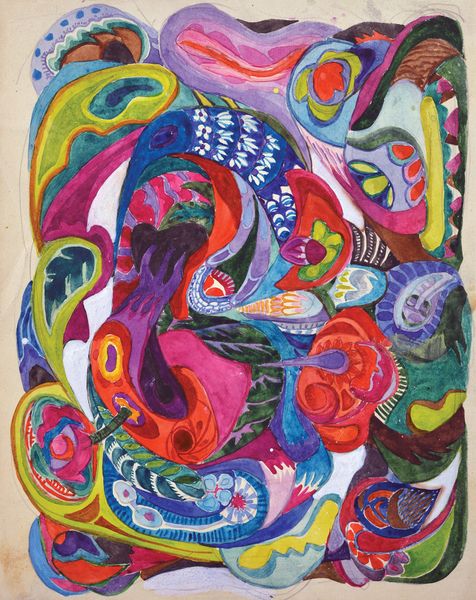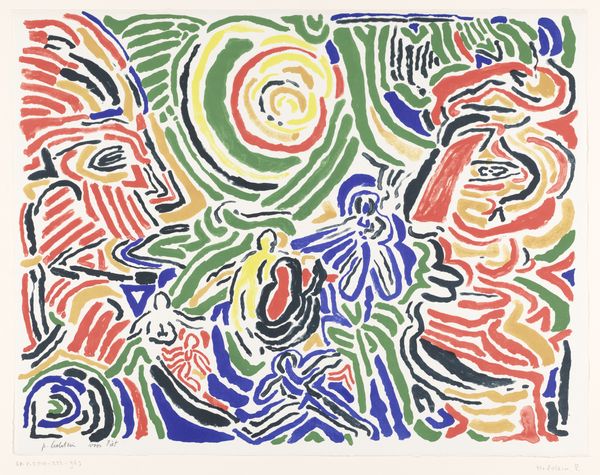 Curator: What a dizzying array of shapes and colors! It feels like a carnival exploded onto the canvas. Editor: Indeed. Let's delve into Frank Stella's "Juam," currently housed in the Tate Collections. It's a compelling example of his later, more maximalist phase. Curator: Maximalist is an understatement! The overlapping forms challenge any sense of depth, and the contrast between rigid geometric patterns and organic shapes creates a fascinating tension. It's as though he's rebelling against his earlier minimalist works. Editor: He is also reflecting the late-century shift towards embracing complexity and pastiche, in part rejecting the notion of high modernism. The image becomes a site where all these elements intersect. Curator: There's an almost overwhelming sense of freedom here. The lack of any clear focal point encourages the eye to wander and explore. I feel like I could look at it for hours and still discover new details. Editor: Precisely, it requires the viewer to actively engage. It's a dynamic piece, reflecting a dynamic era. Curator: Thinking about art's role, I see it as a symbol of cultural transformation. Editor: I agree. It certainly gives us a lot to unpack, doesn't it?