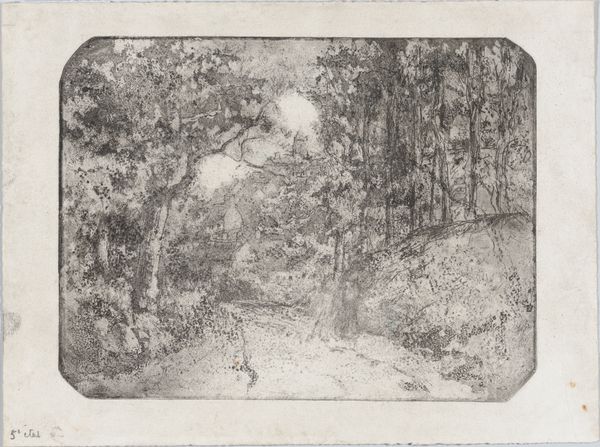 Curator: This is David Lucas's etching, "A Dell, Helmingham Park, Suffolk," created around 1830. You can find it here at the Metropolitan Museum of Art. What’s your initial take on it? Editor: It's remarkably moody for a landscape! There's a real sense of dramatic darkness—an almost gothic atmosphere with that little bridge disappearing into shadow. It definitely evokes a feeling of romantic melancholy. Curator: That atmosphere is precisely what makes Lucas's work so compelling within the context of British Romanticism. The Dell at Helmingham Park became a popularized subject of art. It reflects a specific kind of Picturesque aesthetic that emphasized dramatic compositions and nature's sublime power as interpreted through human engagement. Helmingham Park represents the traditional social elite and is situated outside of major industrial growth. Editor: That makes sense, especially seeing those figures off to the side. Knowing that detail, I wonder if there's a subtle commentary here. While the landowners enjoyed manicured nature, the broader population was moving to manufacturing urban areas for factory employment? Curator: It’s tempting to read contemporary socio-economic commentary into a work that would be embraced by an emerging middle class demonstrating its access to culture and land ownership. You are pointing to some tension between representations of an ideal life. These prints and paintings provided access, either as a symbol of status for those in this class, or aspirational goals for others. But in Lucas's case, I believe he may have been focused primarily on conveying the atmospheric and textural effects within this tiny ravine using the capabilities of etching. Editor: I think that the atmospheric elements can become intrinsically linked to narratives and ideologies that were very powerful in the early nineteenth century. What were Lucas’ influences, or what can we say of this artistic and social moment in Britain? Curator: The print showcases Lucas's mastery of the etching medium but relies significantly on painting tropes developed by his colleagues during the era, for instance John Constable's paintings of natural vistas in Suffolk. He was particularly celebrated for replicating various textures within his work, and the rich gradations here show how deeply he considered the technical capacities for tone and depth. This approach suggests an intentionality beyond purely aesthetic. It’s attempting to capture, to commodify, a very specific and localized atmosphere through the reproduction of images. Editor: Right. This goes further for me. If the circulation of the Dell landscape signals a desire, perhaps it underscores what a large population never got to experience firsthand and whose livelihoods came at the expense of keeping estates like Helmingham running. Thank you for helping to untangle those complicated undercurrents here. Curator: Thank you. Looking closely allows us to examine not just the art itself, but its broader implications on contemporary culture, too.