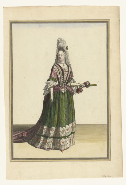 This is Pieter Schenk’s portrait of Maria II Stuart, created around the turn of the 18th century. The composition commands attention with its intricate detail and formal arrangement of the figure within a landscape. The portrait is dominated by Maria's regal attire, where the fabric's texture is meticulously rendered through delicate lines, contrasting with the smooth expanse of her face. The overall structure is inherently hierarchical, with Mary's towering wig and elegant posture immediately establishing her dominance over the surrounding scenery. The artist employs light and shadow to create depth and emphasize the textures of the lace and fabric. However, it’s the tension between these ornamental flourishes and Mary's firm grip on what appears to be a pistol that prompts us to explore the complexities of power. The controlled lines of the engraving serve as a semiotic system, encoding not just aesthetic beauty, but also the societal expectations and political tensions inherent to her position. Notice how the portrait is more than just a representation, it's a carefully constructed statement about authority, rendered through the formal language of art.
