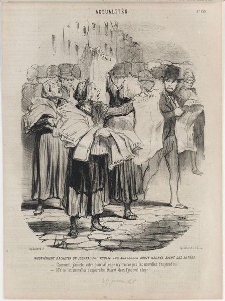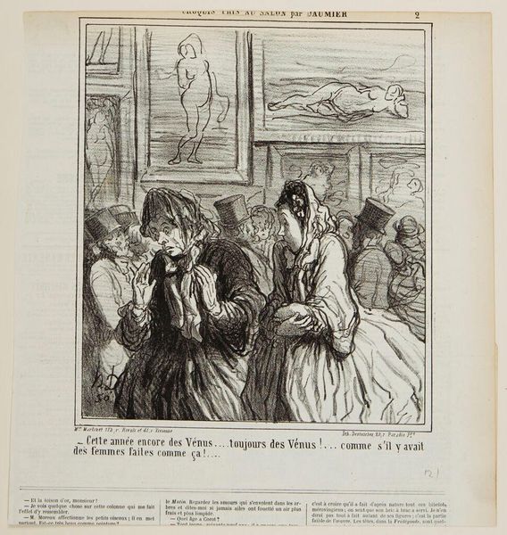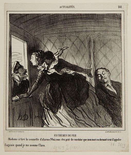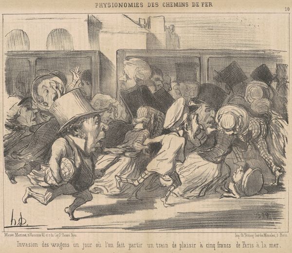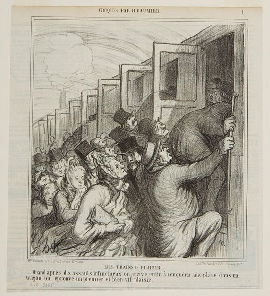 Curator: Daumier's lithograph, "Travelers Enjoying a Third-Class Carriage Less and Less in Winter," depicts the stark realities of 19th-century rail travel. It's currently housed at the Harvard Art Museums. Editor: The desaturated tones really amplify the bleakness. It’s a cramped space filled with weary faces, each etched with a quiet suffering. Curator: Absolutely. Daumier was known for his social commentary. He highlights the inequities of class through the experience of these travelers. Editor: You can almost feel the chill in the air, a shared hardship cutting across age and perhaps even social standing, if only for the duration of this journey. There’s a profound sense of shared humanity here. Curator: Indeed. This work is a reminder that art can serve as a powerful lens through which we examine societal structures. Editor: A somber, yet deeply resonant reminder, especially when considering contemporary mobility and social justice.