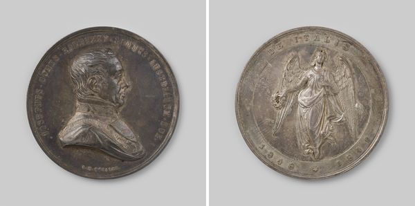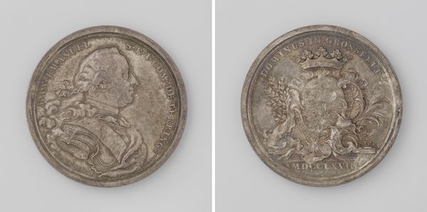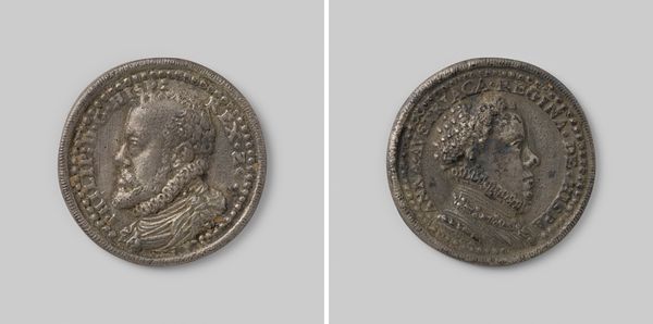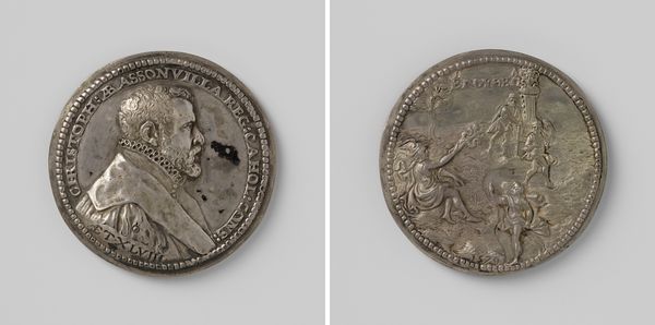 Curator: Look at the patina! It lends such an ethereal quality to this double-sided metal relief currently housed at the Rijksmuseum. The piece dates back to 1582 and portrays "Francois, hertog van Anjou en Alençon." What are your initial thoughts? Editor: It's... muted. There's an almost haunting pallor to the metal that impacts the figures depicted. Even though it is sculpture, it feels two-dimensional. What historical narratives are enmeshed within this medallion? Curator: As a tangible object circulated amongst elites, it represented and performed Anjou's political aspirations. Note how the relief presents a stoic, almost detached profile, fitting the codes of masculinity during this era. One side shows his visage, and the other features a landscape dominated by a radiant sun rising over water. Editor: Yes, I observe a sunrise or perhaps a beacon, situated just above what looks like turbulent waves, contained within the disc's circumference. Semiotically, that contrast jumps out: the turmoil of water versus the beaming light. This could symbolize the volatile political climate in which Anjou was attempting to shine. Curator: Precisely! And that volatile climate was very fraught. As Duke of Anjou, he sought sovereignty over the Netherlands during a time of intense religious and political conflict. Consider, too, how these portrait medals functioned to propagate power and shape public perception. What does this small object communicate about cultural norms and sociopolitical anxieties during the late Renaissance? How do you see its symbolism resonating across identities? Editor: Beyond Anjou’s historical and personal context, light’s persistent motif creates a sense of dramatic tension. Consider how the circular format interacts with both subjects represented in relief—one the Duke’s profile and the other the powerful symbolism. The artist masterfully works in such confined space, framing those tiny allegories within broader political dimensions. Curator: This medal offers a glimpse into Anjou’s attempts to construct a regal, near mythical persona amidst great turmoil, reminding us that even small artifacts bear complex meanings about larger narratives. Editor: Yes, indeed, there are broader significations; while simultaneously demonstrating remarkable artistry within a limited scale and space, it still speaks to themes both political and personal.