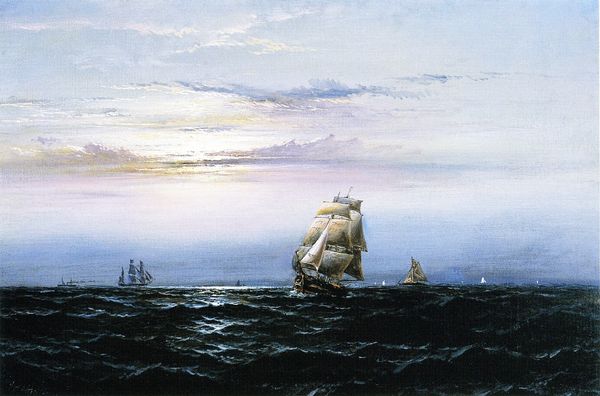 Curator: Immediately, a feeling of operatic drama comes to mind. The light, the ship, those mountains in the distance… it’s so romantically theatrical! Editor: Indeed. This is "Ship at Sunset off Cap Martin", rendered in oil paint, part of Ivan Konstantinovich Aivazovsky’s notable landscape work rooted in Romanticism and Realism. Curator: Aivazovsky was clearly smitten with light – the way it blazes across the water is almost hallucinatory. Editor: Absolutely, and this is no accident. Maritime painting, especially during the Romantic period, often employs light as a symbol of divine presence or transcendence. Here, the ship itself could be viewed as a vessel carrying souls through turbulent life toward enlightenment. Curator: That makes so much sense, especially given how small the figures are in that rowboat compared to the ship. Almost dwarfed. It speaks volumes about the individual’s journey against the grandeur of the universe. Editor: Observe how Aivazovsky crafts that feeling using contrasts. Notice how cool, muted colors of the distant mountains offset the fiery hues of the sunset. The texture of the sea, depicted in visible, energetic brushstrokes, pulls the eye forward. These details serve as reminders of the potent, dynamic energy inherent to both nature and the human experience. Curator: What resonates with me most profoundly are those soft pink clouds—they echo, almost tenderly, the turmoil brewing down below. This touch subtly unites tranquility with turbulence in a really lovely way. It also seems to imply a connection with past iconic art pieces of ship journeys. Editor: An astute observation! Throughout centuries ships at sea recur in visual vocabulary as metaphors for navigating existential uncertainty—journeys beset with trials where storms loom. Curator: Yes! Thinking about cultural continuity, it's incredible how consistently art mirrors our innermost ponderings… What stories, myths, hopes, or perhaps even anxieties lie deeply embedded inside of our symbols over time. Editor: It enriches the moment, doesn't it, understanding our visual heritage through such vibrant symbolism!