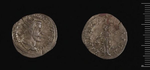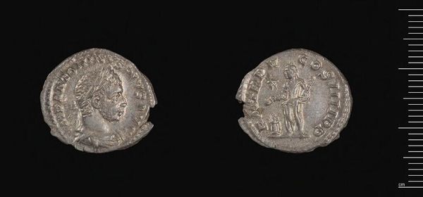 Editor: This is a Denarius of Severus Alexander from Harvard Art Museums. It's quite small, and worn, but the details are still striking. What do you see in this piece, focusing on its formal qualities? Curator: The most compelling feature is the incuse relief, showcasing an impressive manipulation of depth on such a restricted plane. The artist’s adept handling of line and texture creates a clear distinction between the figure and the ground, accentuating the portrait's solemnity. Notice how the artist uses the circular form to dictate the composition, achieving a balanced yet dynamic visual effect. Editor: That’s fascinating. I hadn’t considered the effect of the circular form so deliberately. Thanks! Curator: Indeed. Reflect on how these intrinsic qualities contribute to the overall aesthetic impact.