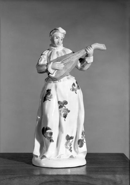 This is a delicate porcelain sculpture called 'Musician', made by the Meissen Manufactory. Notice how the figure's form is carefully constructed. The porcelain is expertly molded and glazed to create smooth surfaces and sharp details. The contrasting matte finish in the face and shiny glaze of the musical instrument invite us to consider surface as a signifier. Consider the interplay between material and form, how the rigid porcelain captures the fluidity of fabric and soft curves of the human body. This tension between medium and subject allows the sculpture to transcend its material origins. The sculpture challenges our expectations of traditional representation. Its lasting appeal lies in its formal complexity and ability to engage us in a dialogue about art, representation, and material culture.