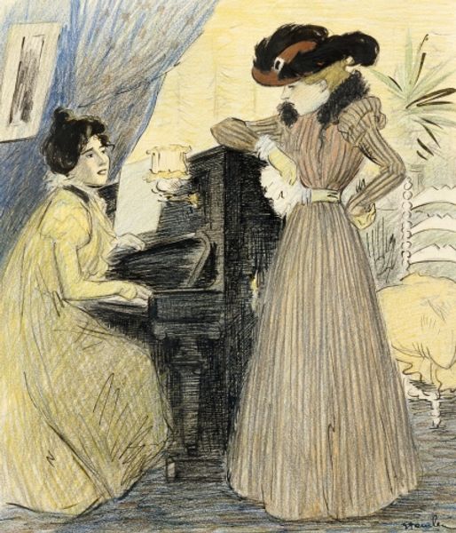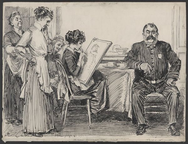 Curator: This is an ink drawing by George Du Maurier from around 1865. It’s titled “--And mist or glim, I'd sail with him, if he would sail with me--”. Editor: Immediately, I sense a story unfolding here. The cross-hatching is beautifully delicate, giving the scene a certain hushed intimacy. A woman sits at the piano, while a man watches. There's a stillness, almost a tension, in the air. Curator: Considering the date, the social conventions of Victorian England definitely color the dynamics we see. The positioning of the piano in domestic spaces highlights its function as a social tool. It's also a subtle commentary on women's roles. Editor: Precisely! And think about who would have the leisure and privilege to dedicate time to musical pursuits. It speaks volumes about class and gender. I am drawn to the blindfold on the woman. I want to know what power relations or commentary on sight are suggested here. Curator: Good eye! The artwork operates on many levels of performativity. The blindfold subverts expectations – while she might be playing for him, the gesture evokes ideas of hidden identities and repressed desires that haunt a seemingly proper domestic scene. Is this drawing highlighting her musical talent, or also revealing how gender norms dictate a restricted existence? Editor: Also, the title suggests a longing, a potential adventure – but is the possibility equally shared? Is it a subversive message hinting at her limited freedom, especially regarding marriage choices? Her flowered robe looks quite beautiful. But could we view that fabric itself through the globalized fabric trade of colonialism? Curator: Those are powerful questions that make this work still so pertinent to our moment! Even as an ink drawing depicting an ostensibly simple domestic moment from the past, the artwork challenges us to see the complex layering of Victorian society. Editor: It serves as a poignant reminder to continuously dissect history, seeing past pretty surfaces to understand power structures that continue to echo through generations. Curator: Indeed. The artwork challenges us to find ways of sailing forward by looking through the mist and glim of our present.