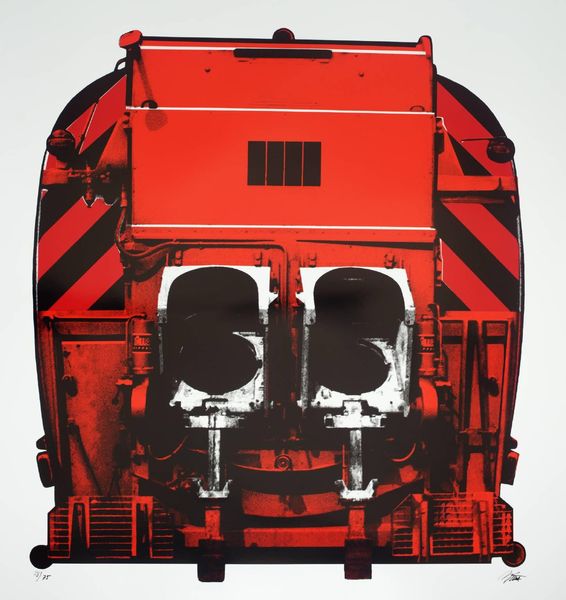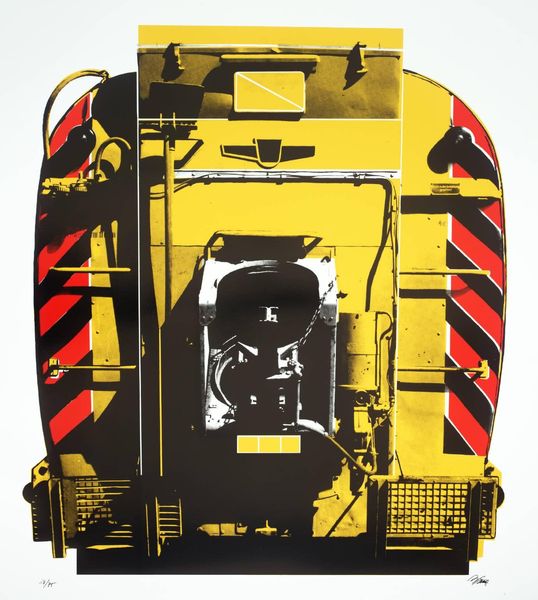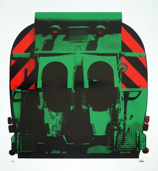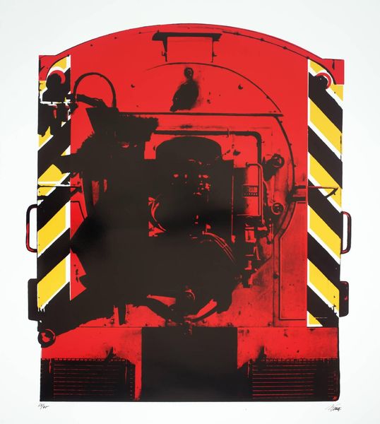 Curator: Wow, that machine seems poised, almost like it's guarding a secret, doesn't it? Editor: Indeed. This is an untitled screenprint by Gerd Winner, part of the Tate collection. Winner, born in 1936, often focused on urban and industrial landscapes. Curator: It feels monumental, in this flattened, graphic way. The juxtaposition of those cool blues and stark reds is strangely unsettling. Editor: The limited color palette serves to highlight the starkness and functionality of industrial architecture, and perhaps comment on the socio-political landscapes they shape. Curator: I like how it makes the coldness feel… almost beautiful? Editor: Exactly. Winner prompts us to reconsider the aesthetics and meanings we project onto the structures around us. It's like a machine made into a monument. Curator: Well, I'm certainly seeing it in a new light. Editor: Me too. It's always rewarding to pause and reflect on these everyday giants.