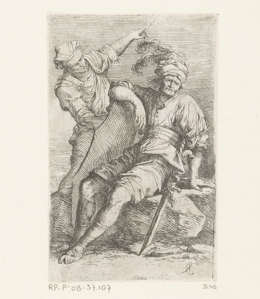 Curator: Up next, we have "Vier soldaten," or "Four Soldiers," an etching by Salvator Rosa, likely created between 1656 and 1657. Take a moment to let your eyes wander over it. What’s your initial take? Editor: It's immediately striking, this little vignette. A mood of brooding tension hangs heavy, doesn’t it? The sketch lines create an atmosphere that feels secretive, like a scene glimpsed in shadow. Curator: Rosa's technique in this work is captivating. Notice the confident, almost frantic etching lines, bringing a sense of immediacy to the scene. He was, after all, a master of the etching medium. It allows a wonderful freedom in capturing movement and texture. Editor: Absolutely. There's a raw, almost unfinished quality to it, and yet the composition holds. I see a few soldiers—well, four, as the title states. One holds what looks like a halberd, while another is seated above, almost gesturing accusingly, wouldn't you agree? They seem lost in thought or perhaps engaged in a hushed debate? Curator: Possibly so, and these figures... look at how Rosa masterfully arranges them, playing with overlapping forms to suggest a hidden narrative. It’s classic Baroque, the use of diagonal lines to create dynamic compositions. Also notice how little detail there actually is. Through a few skillful strokes, the artist’s characters come to life before our very eyes, fully textured in form. I'm captivated! Editor: And think about it – etching at that time wasn't necessarily about polished refinement, but more a space to convey immediacy. Rosa utilizes it to capture the grim reality of military life—the weariness, the tension. It’s like looking at a charcoal drawing. Even though it's called printmaking it also comes off like this might be an illustration. It's the tension, the drama. Curator: True enough. This work embodies an intimate and raw vision—rough around the edges yet intensely expressive. You can’t help but think about the soldiers that inspired the work! The scene almost pulls you in… Editor: Ultimately, for me, it is the emotional resonance, it evokes that feeling so successfully. A moment frozen from time, made immortal by line. Curator: Indeed, and it underscores Rosa's profound understanding of the human condition amid conflict. It really sticks with you, this one.