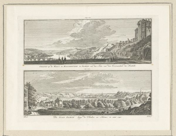 Editor: This engraving, “Gezicht op Beez en Gezicht op Flawinne, 1740”, by Hendrik Spilman, depicts two serene landscapes. It feels almost like looking at postcards from the past. What stories do you think these images are trying to tell us? Curator: It's interesting you use the word 'postcards' – these aren't just neutral depictions, they are deliberate constructions embedded with cultural memory. These scenes act as visual anchors. The churches are prominently displayed – what do they suggest to you about the social importance and dominance of religion? Editor: I hadn't really thought of it that way. The churches definitely stand out. I guess they symbolize stability, perhaps? Curator: Exactly. And think about the strategic placement of these villages near water – vital trade routes and sources of life. Landscape imagery reinforced identity; ownership and order within the community, and for the wider state too. Even the clothing of the figures gives insight to status. It really underlines how the details coalesce into powerful visual cues. How would you characterise them now? Editor: So, more than just pretty scenery, they're encoding status and cultural importance through familiar symbols. Curator: Precisely! Every stroke of the engraver’s tool has a purpose; recording cultural priorities in enduring images that transcend mere representation. I wonder what people made of them at the time... Editor: It's amazing how much can be read into a seemingly simple image. I'll definitely look at landscapes differently now. Curator: Good. Art invites us to ask such questions and question those that have been asked for centuries. It encourages a continuous process of revealing layers of symbolic meaning over time, both personally and socially.