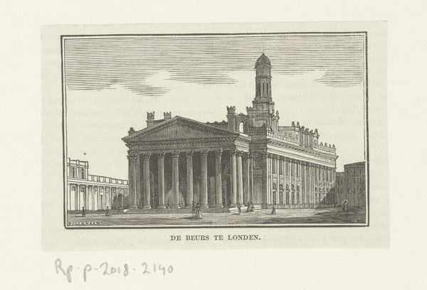 Curator: I'm drawn to the sense of scale and atmosphere in this 19th-century print. Titled "Gezicht op St Paul's Cathedral, te Londen," or "View of St Paul's Cathedral in London," it's attributed to an anonymous artist. Editor: My immediate thought is the incredible precision and control achieved using etching and engraving. Look at those delicate lines capturing the massive stone facade! You can almost feel the weight of the materials. Curator: The cathedral becomes a symbol here. Rebuilt after the Great Fire of London, it embodies resilience, the enduring power of faith, and, on a wider level, civic pride. Even in the midst of Romanticism, Neoclassical order projects dominance. Editor: Absolutely. Consider the labor involved—the craftsmanship necessary to produce such detailed lines and repetitive architectural elements. These prints, though often seen as "lesser" art, represent immense skill and are by no means easily reproduced. We should really consider these under-recognized art forms. Curator: Note the figures in the foreground—they accentuate the size of the building. It really enhances the sublime presence of the cathedral. Their dress also places it within a specific historical and cultural moment, creating a scene of quotidian London life with this backdrop of permanence. Editor: I'm also thinking about the dispersal of information—this was a pre-photographic means of distributing knowledge, especially to those who might never see the real structure in person. An engraving, then, functioned as an accessible representation of British identity and ingenuity. Curator: This makes me think about the transmission of ideals through images. Beyond national pride, consider the propagation of architectural principles, as neoclassicism shaped not only Britain, but European and American thought, creating a visual lingua franca, literally engraved here for prosperity. Editor: Seeing St. Paul’s represented in this way underscores how deeply tied cultural landmarks are to methods of production and broader systems of labor. A stone here may well represent countless hours of skilled handiwork and an often neglected understanding of making and materials. Curator: So, what seems like a mere rendering speaks volumes about societal values embedded within architectural representation. It also speaks volumes about its continued role within Britain's psyche. Editor: Indeed. It's in carefully studying these works of “applied” art we can appreciate the relationship between craftsmanship and national identity.