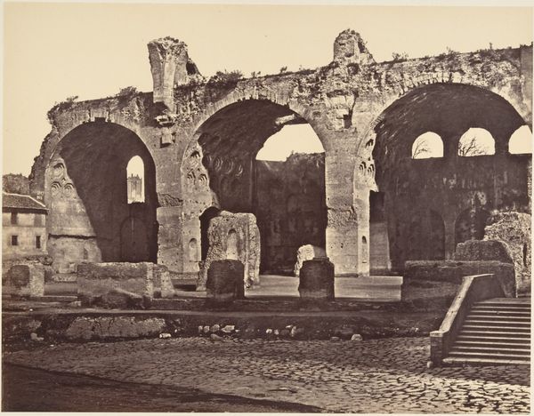 Giorgio Sommer’s photograph captures the Casa di Pornai, presenting a stark, frontal view of the ruins in Pompeii. The composition divides into two distinct zones. The dark, cavernous archway on the left is juxtaposed against the row of solid, cylindrical structures to the right. The photograph’s tonal range is quite limited, enhancing the textural contrasts between the rough stone and brickwork. The linear arrangement of the cylindrical objects creates a rhythmic effect, a sequence broken only by subtle variations in their form and surface. Sommer’s approach is less about romanticizing the ruins and more about documenting their structural qualities. It invites contemplation on the passage of time and the enduring nature of form. The work’s focus on the interplay of light and shadow also draws attention to the way architectural forms define space. In its structured presentation, this photograph offers a rigorous look at the ancient world.