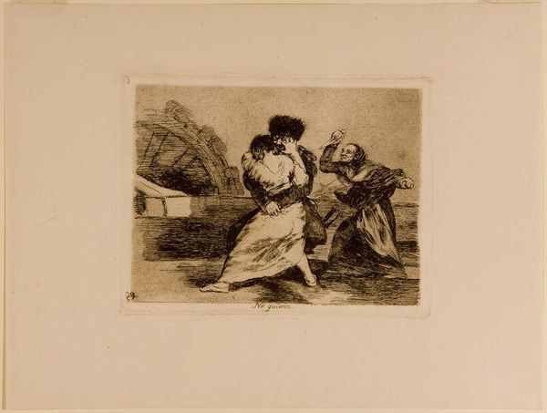 Curator: Here we have Francisco Goya's etching titled "What Is This Hubbub?" from his Disasters of War series, housed at the Harvard Art Museums. What sensations arise for you when you view it? Editor: Chaos and dread. The swirling lines and dramatic contrasts give off a sense of urgent danger, a disruption of some sort. There is a figure in distress, clearly. Curator: Indeed. Goya created these images to convey the atrocities of war. The central figure's posture and the leering men certainly evoke a sense of vulnerability and the violation of innocence. It’s quite raw, really. Editor: I agree. The inscription beneath the image, which translates to “Who can avoid it?”, suggests the inevitability of suffering, especially for women during conflict. It implicates all of society. Curator: It's a chilling reminder of humanity's capacity for cruelty and the enduring consequences of war, as well as being a hauntingly beautiful work of art. Editor: Absolutely. Goya forces us to confront uncomfortable truths and question the structures that perpetuate such violence. It makes me think about who is made vulnerable, and why.