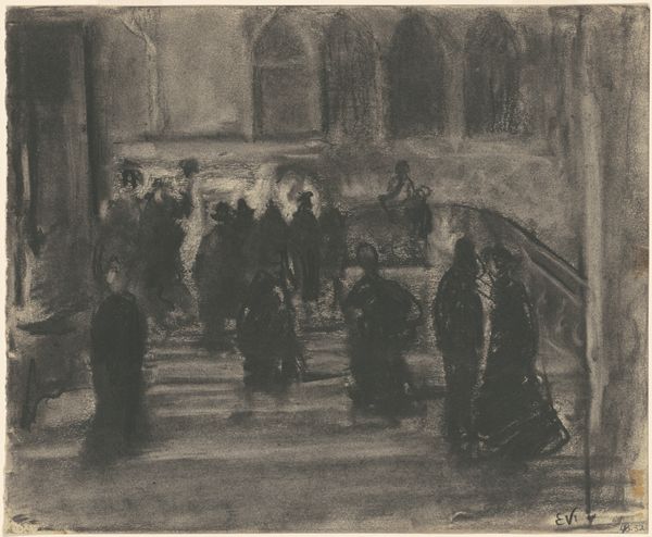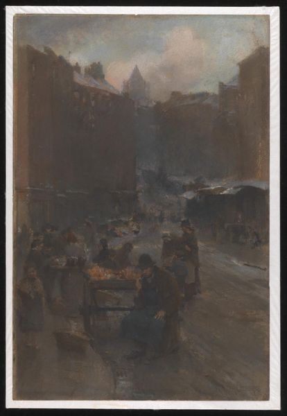 Curator: This painting really has me hooked. I mean, look at this swarming mass, but there is also loneliness to it. You feel it? Editor: I do. Standing here in front of Ferdinand Brütt's "In the Stock Exchange," painted in 1891, you immediately sense that nervous energy—almost a miasma. It captures a pivotal moment, doesn't it? The rise of industrial capitalism rendered in oil on canvas. Curator: It's definitely got that churning feeling, doesn't it? You know, as if someone painted anxiety itself. It’s mostly greys and browns, with fleeting light cutting through—which adds to the overall anxious vibe. It almost feels like you could lose yourself entirely here, get swallowed up, spit back out. I’ve definitely felt that way during my worst creative droughts. Editor: Exactly. Consider the time. We see the Gilded Age's promises—growth, opportunity—but also its precarity. These aren't portraits; they are types, figures representing labor, capital, power… and its absence. It's fascinating how Brütt positions them within that architecture, making it complicit. Those grandiose arches almost mocking the frantic gestures of the men beneath them. It speaks to power structures far beyond mere economic exchange. Curator: It’s interesting that you use the word "types." I sense it, too! These dark suited, pale-faced men standing shoulder to shoulder look so homogenous. I'd hazard a guess they probably believe in some similar things, you know, like…status and control. Did Brütt perhaps want to convey that the "players of the game" are not unique? Editor: I think that’s spot on. And by showing the figures this way, I also find myself reflecting on the gendered dimension—these are men inhabiting a sphere largely constructed by and for them. Curator: True! This sea of masculinity makes me wonder what they risked. Did they come from anything? Or did their ambition come from something even bigger than themselves, an abstract structure? It makes me grateful for my more bohemian life, if I'm being honest. Editor: Brütt, I believe, gave us more than just an impression of a stock exchange. This painting speaks to us even today, capturing not just a moment in time, but an ever-relevant aspect of modern societies and economies. Curator: Agreed. There is an energy in it. An almost self-destructive force to that drive. Maybe I will pass on my stock investments today.