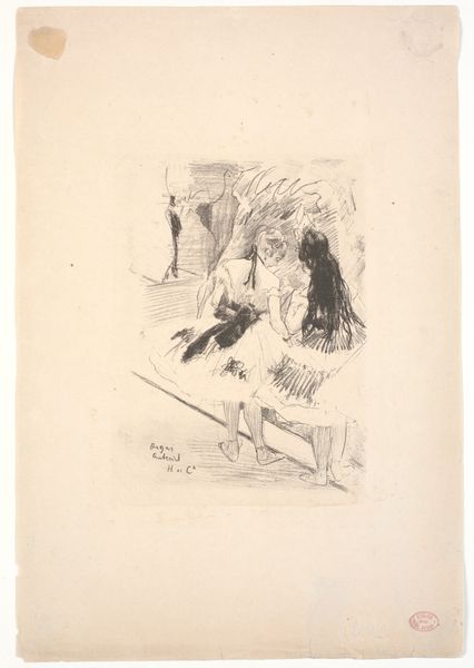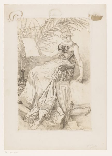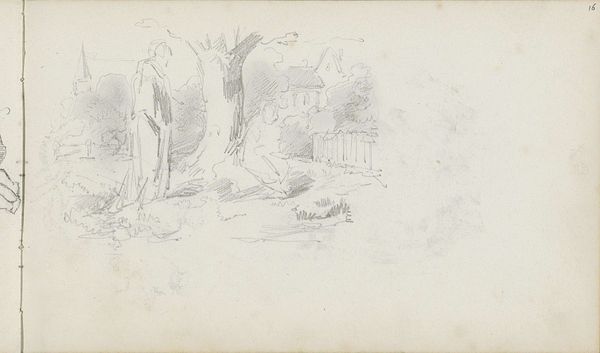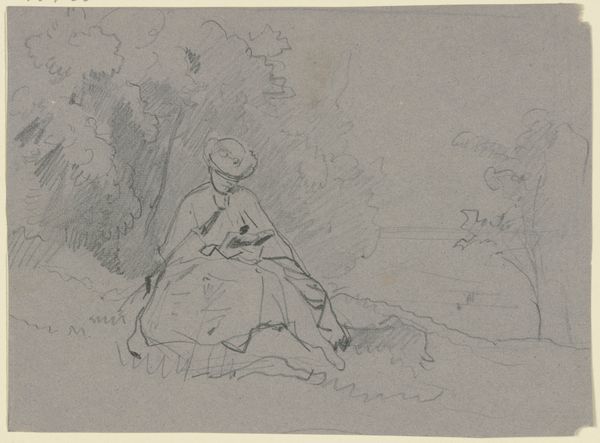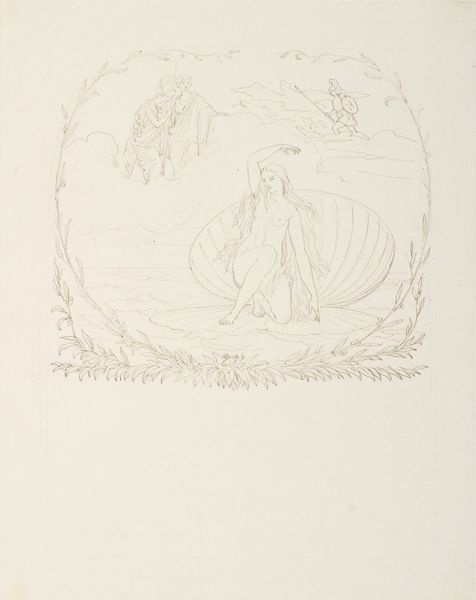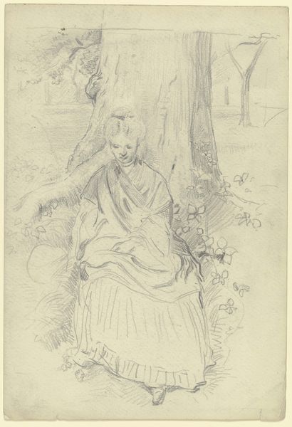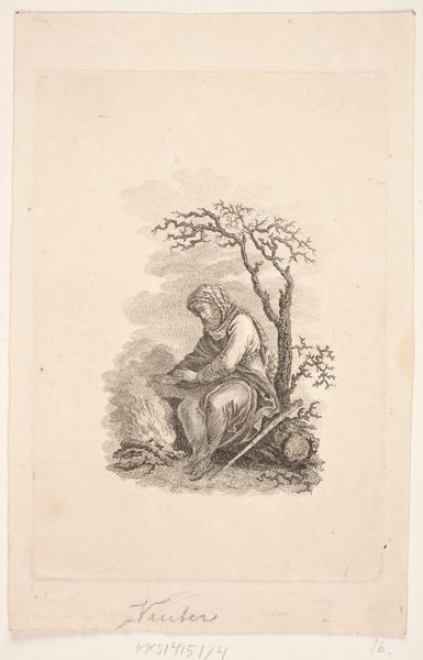 Editor: So, this is Adolph Kittendorff's "Indledning," created in 1862. It appears to be a lithograph or drawing, quite delicate in its rendering of a woman in a field. It has such a peaceful quality. What's your take? Curator: The calmness you perceive is quite interesting given the context of its production. 1862 Denmark saw heightened social tensions; industrialization was rapidly changing the rural landscape and challenging traditional ways of life. Do you notice any visual cues that might subtly reflect these societal anxieties within such an idyllic scene? Editor: I suppose the figure is working the field and therefore perhaps representative of an old social structure? I guess that I also notice the framed composition. The framing with the floral decoration seems to keep the pastoral scene separate from some other potential reality. Curator: Exactly. The choice of portraying rural life through the lens of Romanticism, carefully framed, tells us much about how the urban elite viewed the countryside - a nostalgic yearning for a simpler past, a retreat from the anxieties of modern life. Editor: It almost feels like looking at a postcard now that you mention that context. Something safe and distant. Curator: Precisely! Kittendorff's choice to present it as such raises questions about art's role in shaping and reinforcing such views. Were such landscapes an honest reflection, or an idealised construct, deliberately obscuring harsher realities? What could have been omitted from such an image? Editor: That's a good point. I hadn't considered the deliberate framing as a political choice, more like an aesthetic one. This makes me consider whose interests were really being served by these nostalgic landscapes. Thanks! Curator: Indeed. And understanding those power dynamics allows us to look beyond the immediate aesthetic appeal and engage critically with the social messages embedded within the artwork.