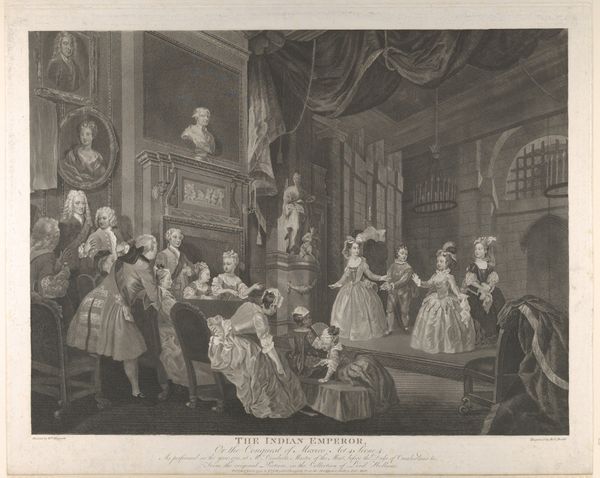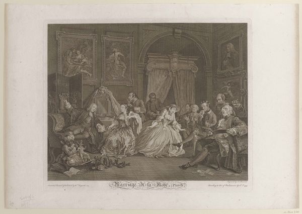Curator: My eye is immediately drawn to the postures in this monochromatic engraving, especially the stark contrast between the seated King and the standing Queen. What's your take? Editor: "Catharina van Aragon pleitend voor Hendrik VIII, koning van Engeland" translates to Catherine of Aragon pleading before Henry VIII, King of England, and in terms of power dynamics, it’s telling, isn't it? The whole scene feels fraught with anxiety, underscored by this cool, neo-classical style—William Ward captured it in 1794. It really captures the personal and political turmoil inherent in gender and monarchal power during this period. Curator: Yes, I see how Ward employs Neoclassical lines to bring gravitas to this pivotal moment in Tudor history. Think of how body language as visual shorthand for inner turmoil becomes particularly loaded in the face of divorce! Catherine's raised hand, index finger extended, isn't just beseeching. It symbolizes truth. The cross pendant hanging prominently might evoke self-sacrifice as a path toward something larger. The way Ward’s style emphasizes line and clear structure feels very considered. Editor: That truth is loaded, though. I agree the details of dress and adornment signal intention, even conviction, but doesn’t her performance mask structural inequalities, deeply gendered legal apparatuses? Even visually, Catherine is given the stage, sure, but Henry literally looks down on her—a potent message about privilege. The work gestures towards individual tragedy, while potentially re-inscribing power. And you know, Henry looking so pensive can signal all sorts of problems for our Queen. Curator: You make such insightful points regarding the gendered hierarchies at play. What strikes me are the mirroring gestures - Catherine extending her hand toward Henry, who, in turn, rests a hand to his face; these symbolic echoes point towards relational entanglement, a dynamic between these people despite what divides them. The faces peering from the background become an uneasy collective consciousness. The overall composition offers more than what historical records themselves reflect! Editor: Exactly. Ward forces us to contend with historical images not as simple representations of the past, but as constructions that inevitably reflect biases and inequalities of their own time, or in the time periods depicted, and these renderings must be questioned in terms of the message they were set to convey. Curator: This really makes me wonder about the cultural memory embedded into artworks like this, and how the way they look shapes future visual cultures as well! Editor: Well said, the social weight of artistic output! So, looking at "Catharina van Aragon pleitend voor Hendrik VIII", through both an emotional, art historical lens, is a critical starting point for broader inquiry.